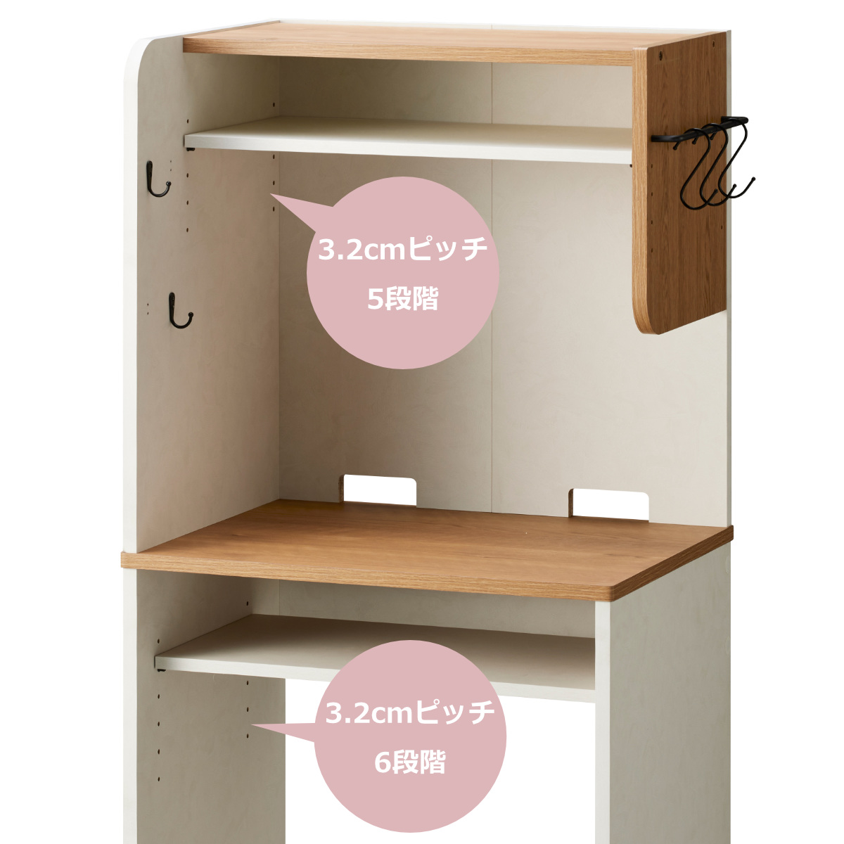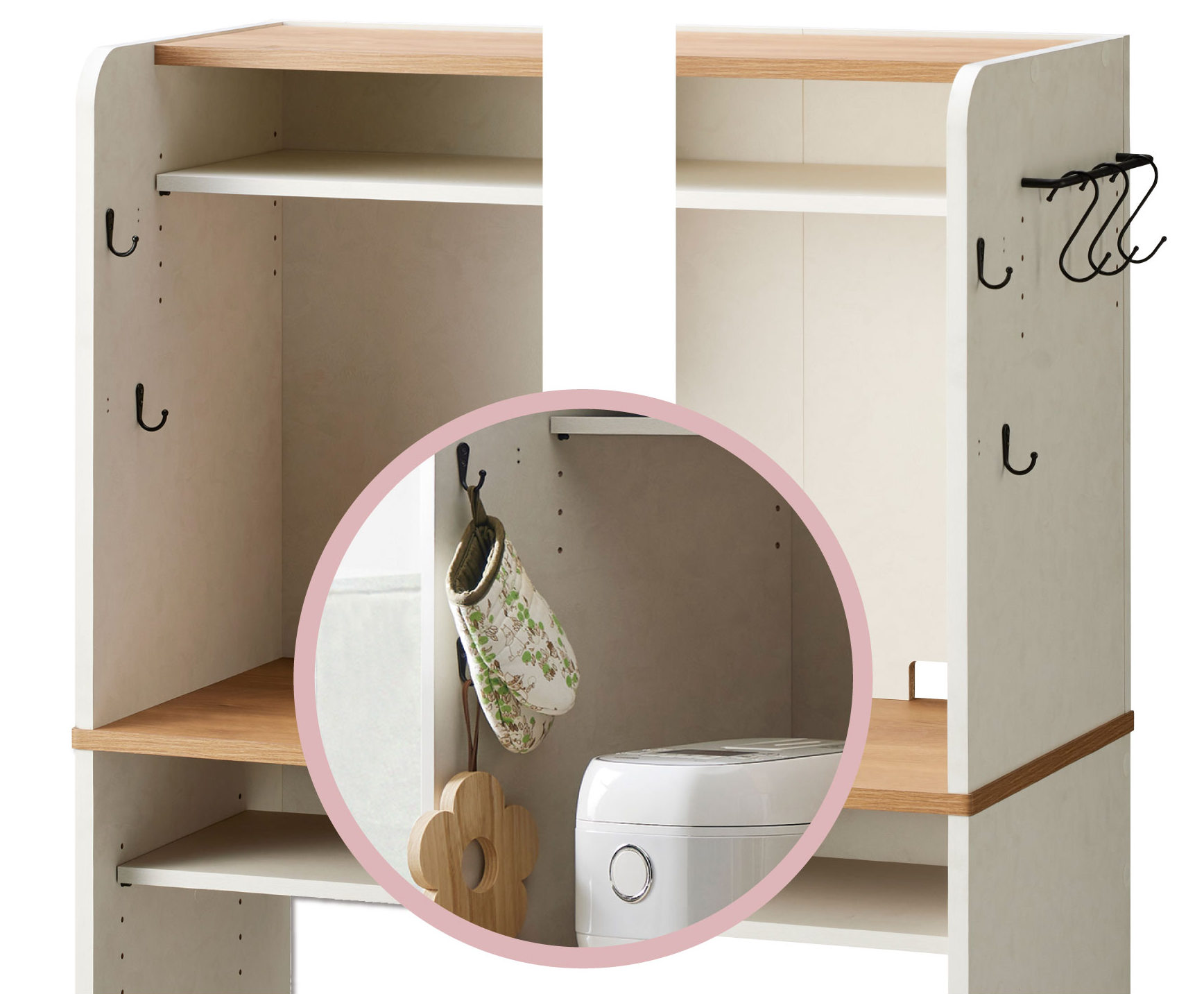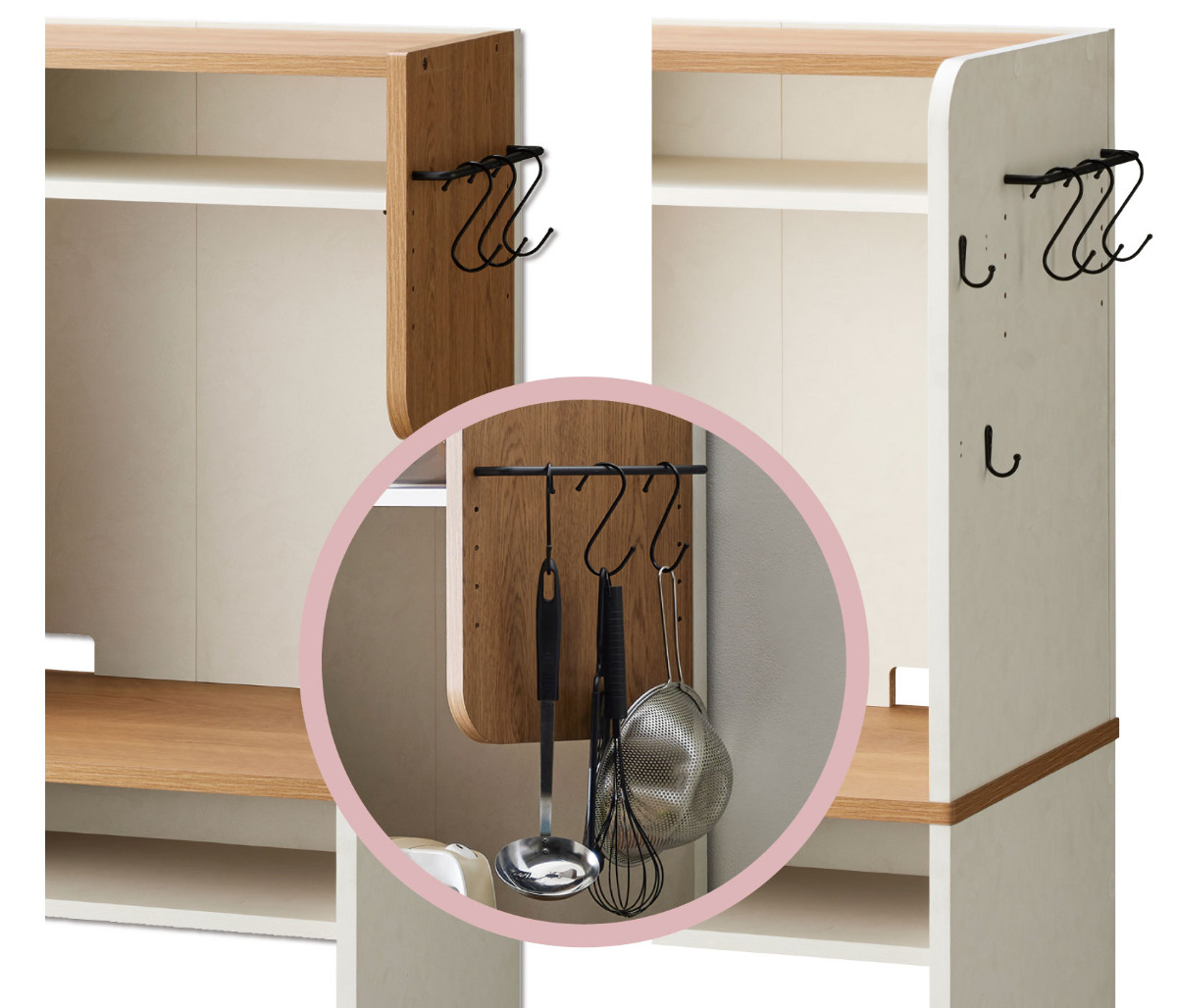 ハンガー1本・S字フック3個・J字フック2個が付属しています。ハンガーは可動棚と同じ穴に取り付けられるので、お好みの高さに調整可能です。タオル掛けとしても使え、キッチンツールもサッと掛けて収納できます。J字フックは内側・外側それぞれ4カ所に設置可能です。
