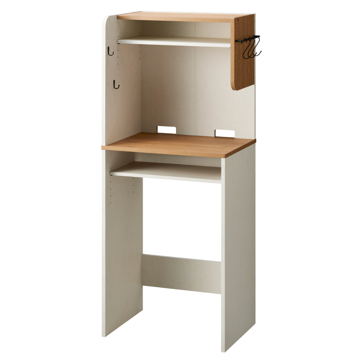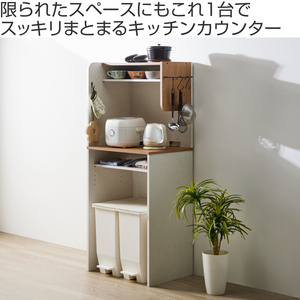 幅59cm・奥行43.5cmのスリム設計で、限られたスペースにもすっきり設置できます。天然木のような木目と塗り壁調のホワイトの組み合わせで、温かみと清潔感のあるキッチン空間を演出します。