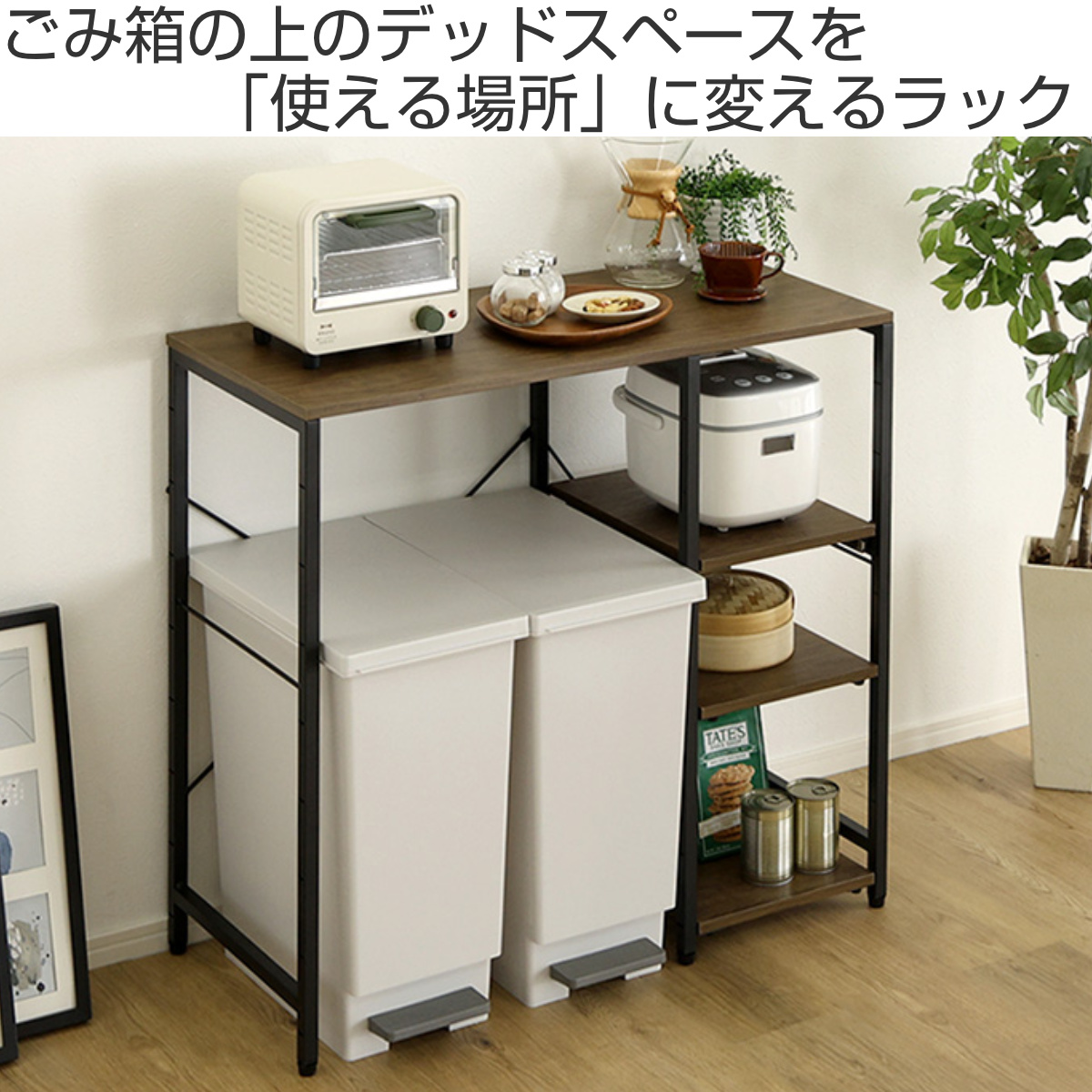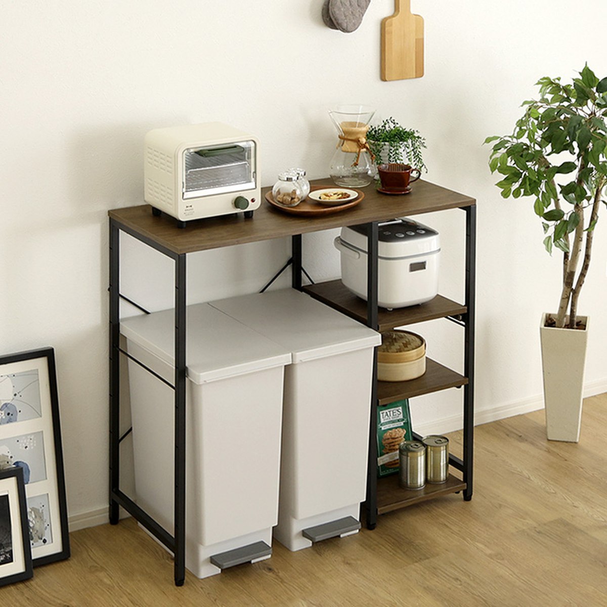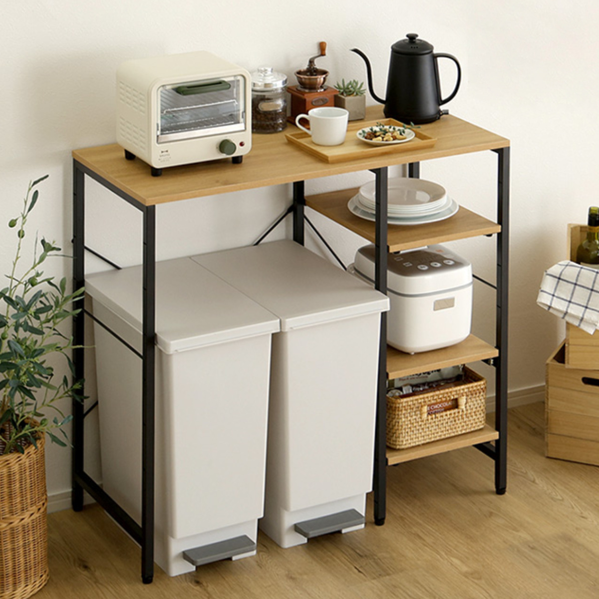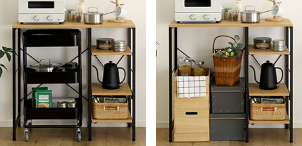 ごみ箱の上に生まれるデッドスペースを、収納と作業スペースへと変えてくれます。幅約90cmの天板は、電子レンジやトースターもゆったり置ける広さ。調理中の一時置きや、ちょっとした作業台としても活躍し、キッチンの動線をスムーズに整えます。