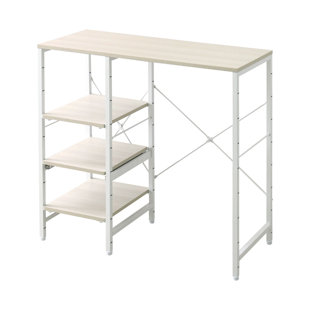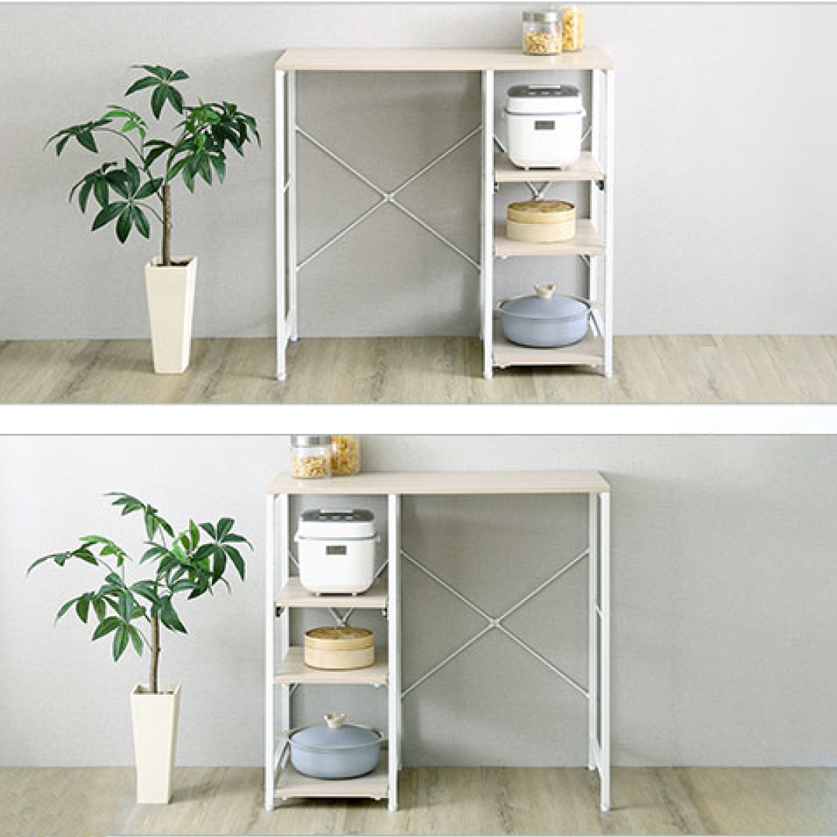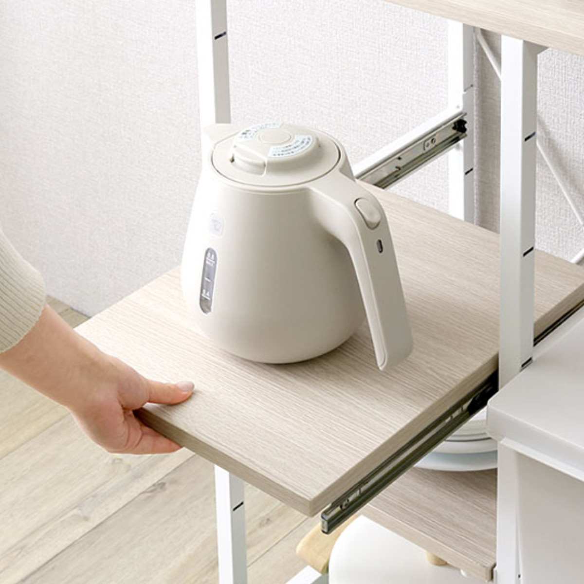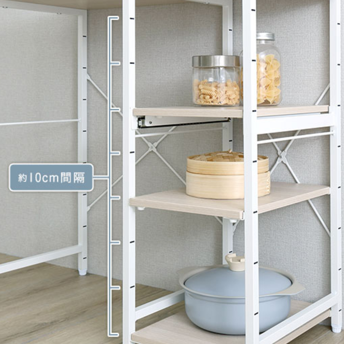 高さを調整できる棚板を採用しています。スライド式棚板は炊飯器や電気ケトルなどの家電を置いたまま引き出せるため調理家電もスムーズに動作します。各棚板は、10cm間隔で高さ調節が可能。棚板をフレームにしっかりと取り付ける仕様で、安定した使い心地です。天板と底板は安全にお使いいただくため、固定棚仕様となっております。