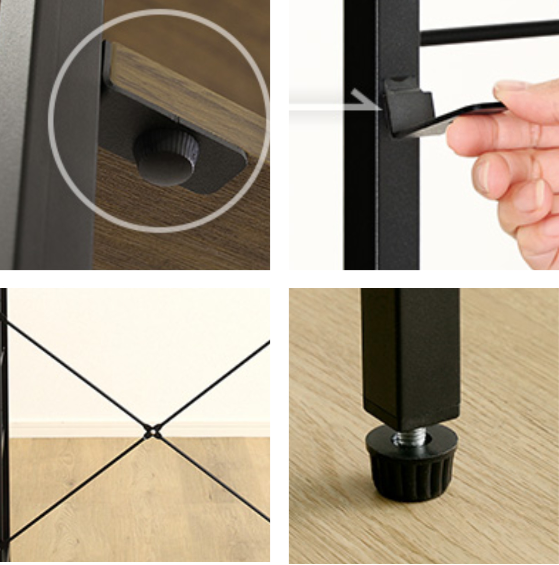 可動棚は、専用パーツでしっかりと固定できるため棚がずれ落ちる心配がなく安心です。筋交いとアジャスターにより、床のガタつきや製品の歪みを抑えます。