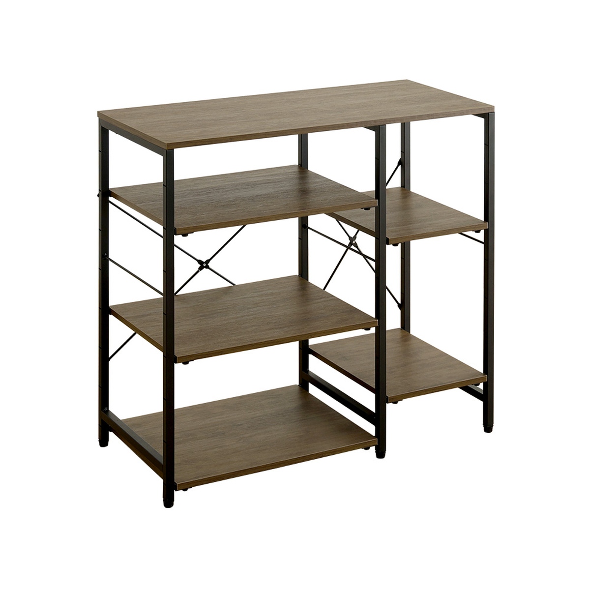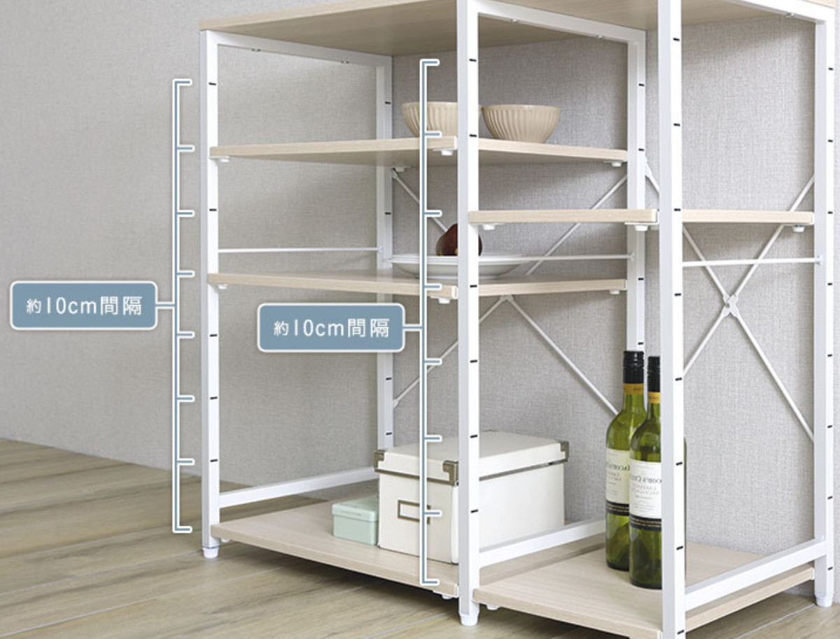 高さを調整できる棚板を採用しています。各棚板は、10cm間隔で高さ調節が可能。棚板をフレームにしっかりと取り付ける仕様で、安定した使い心地です。天板と底板は安全にお使いいただくため、固定棚仕様となっております。
