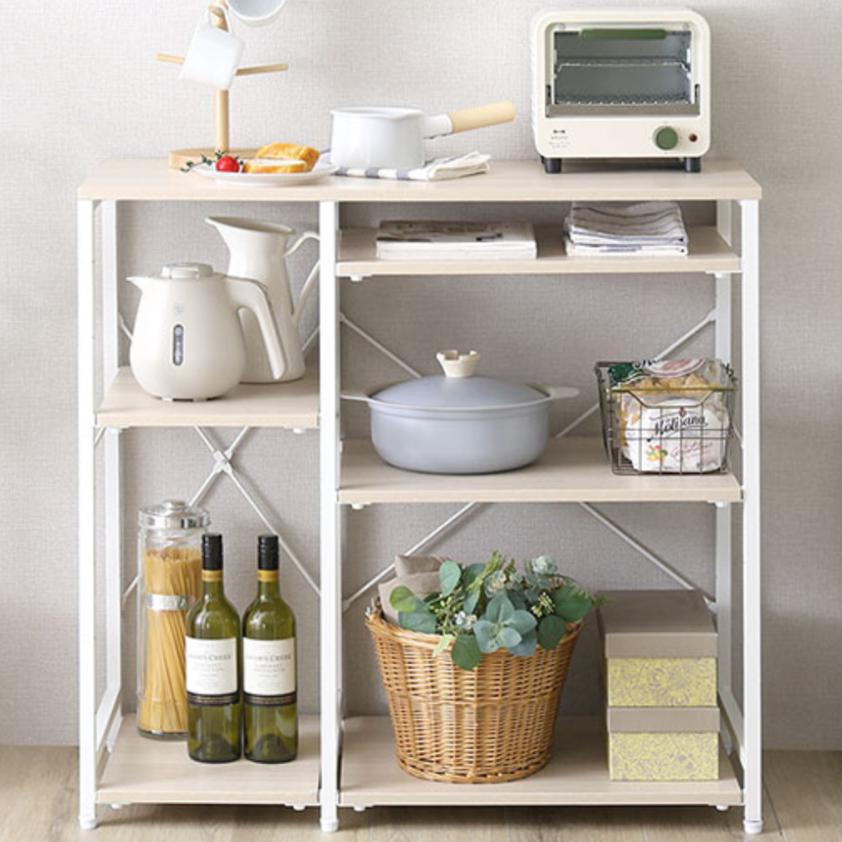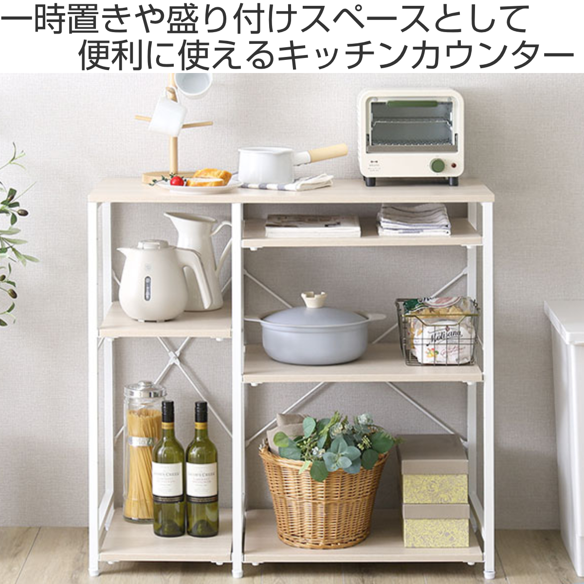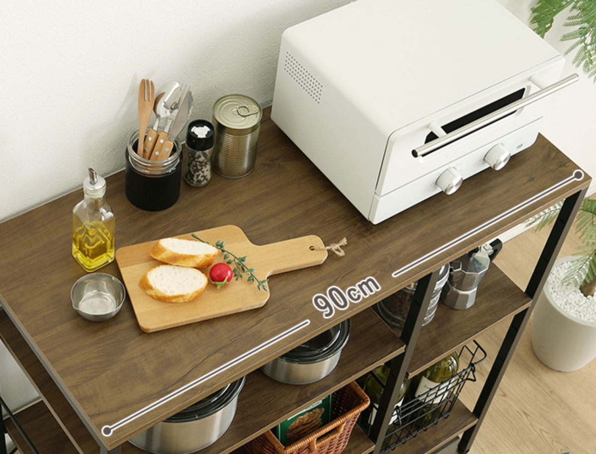 空間にほどよい存在感を与えながら、日常の使いやすさをしっかり支える一台です。幅約90cmの天板は、電子レンジやトースターを置いてもゆとりのあるサイズ感。調理中の一時置きや盛り付けスペースとしても活躍し、キッチン作業をスムーズに整えます。