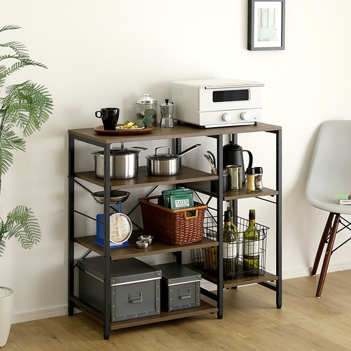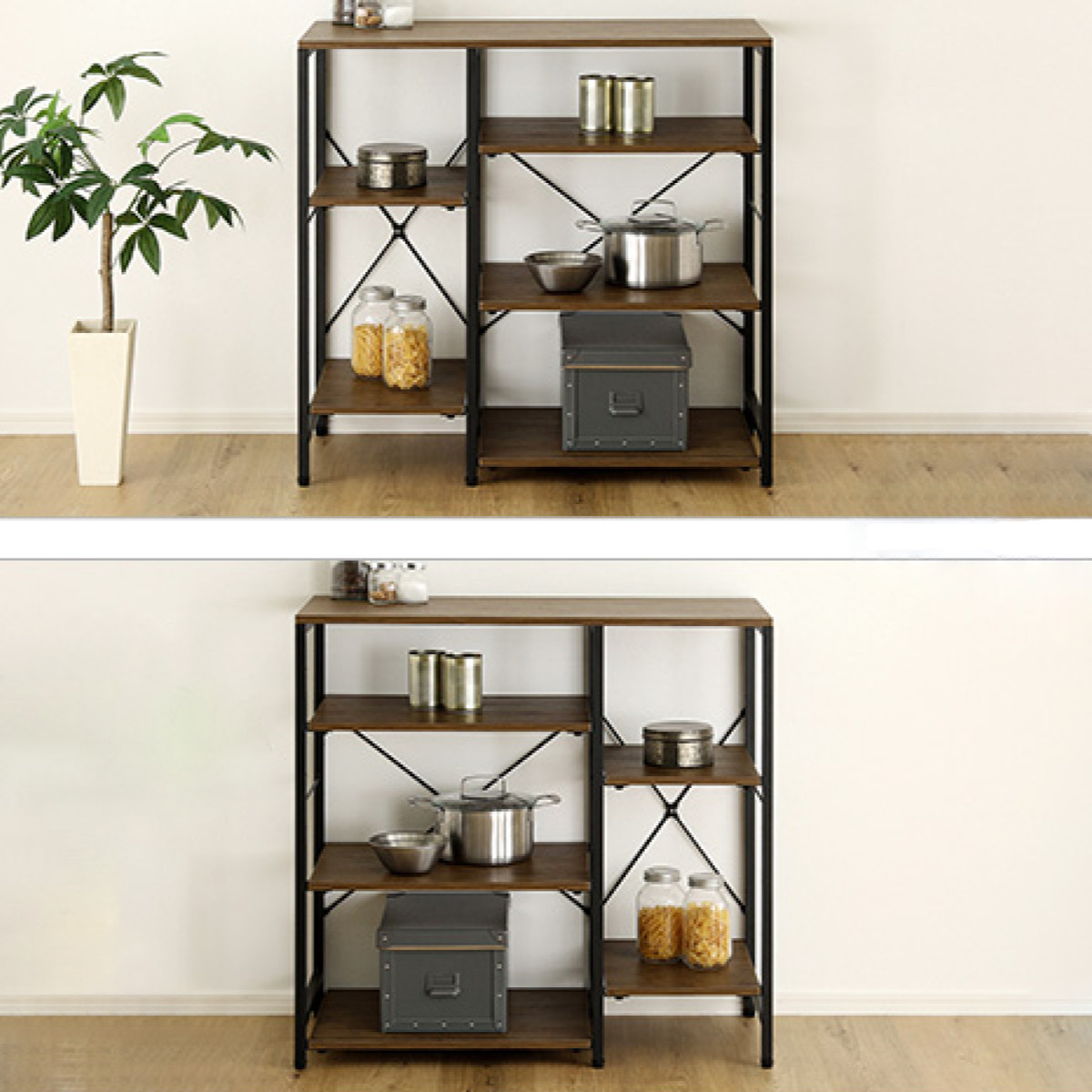 棚部分を左右どちらにも組み替え可能な設計です。設置場所や動線に合わせて、使いやすいレイアウトに調整できます。キッチンの導線に合わせて左右を入れ替えることで、よりスムーズな作業環境を実現。引っ越しや模様替えの際も、空間にフィットする向きへ柔軟に対応できるため、長く快適に使い続けられます。