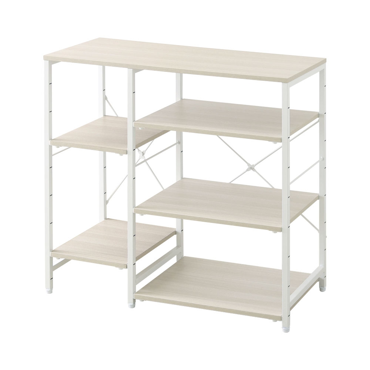 高さを調整できる棚板を採用しています。各棚板は、10cm間隔で高さ調節が可能。棚板をフレームにしっかりと取り付ける仕様で、安定した使い心地です。天板と底板は安全にお使いいただくため、固定棚仕様となっております。