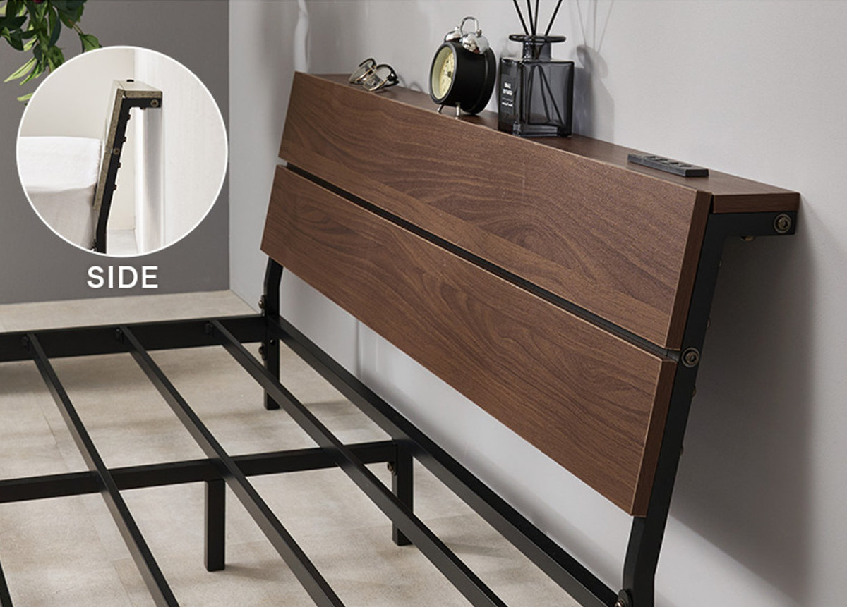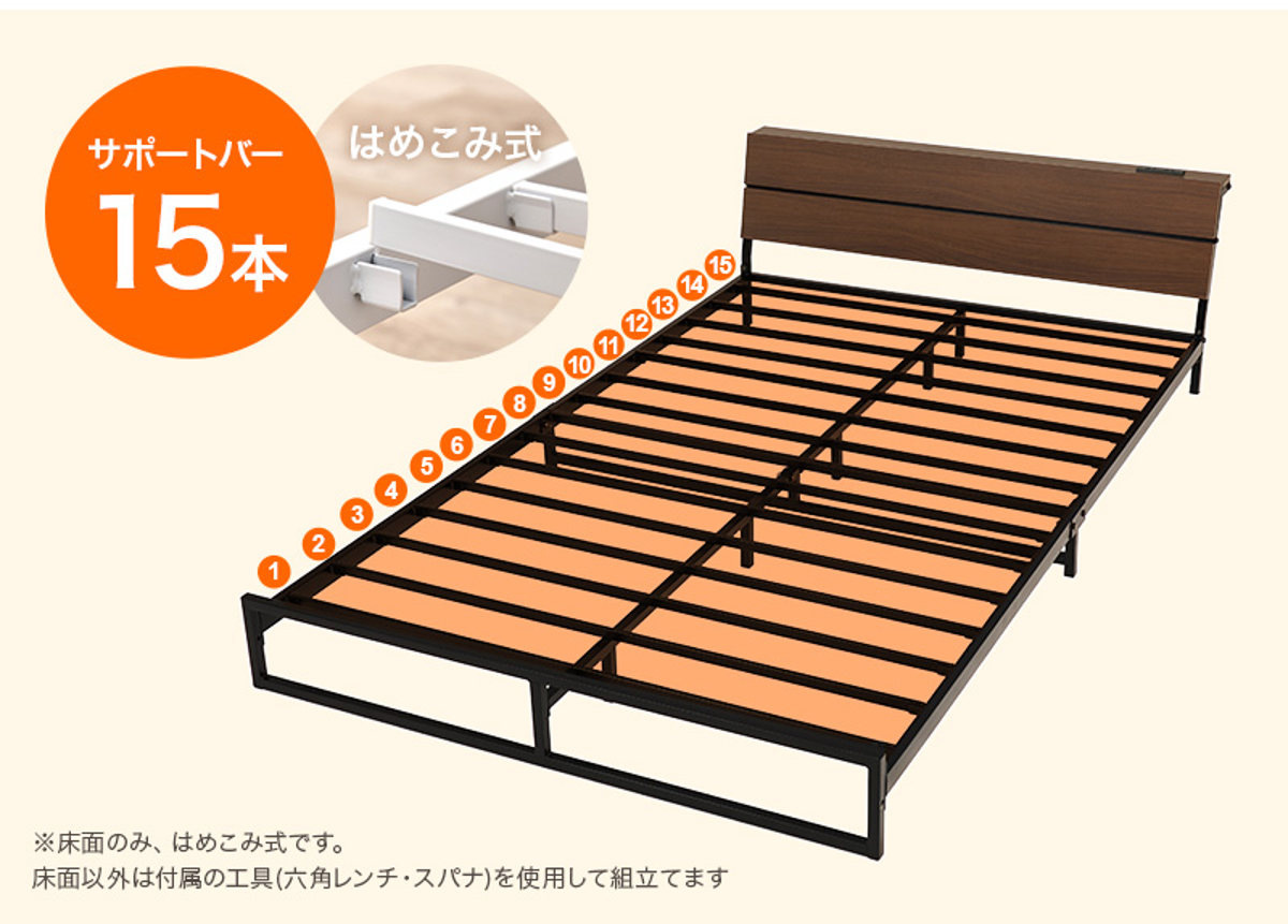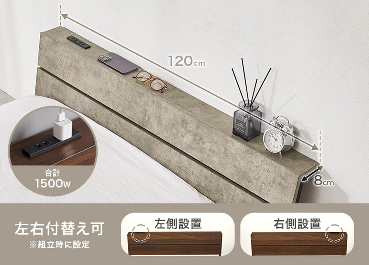 スマホや時計、小物をまとめて置ける便利な宮棚付きです。コンセントはお部屋のレイアウトに合わせて左右どちらにも付け替え可能です。