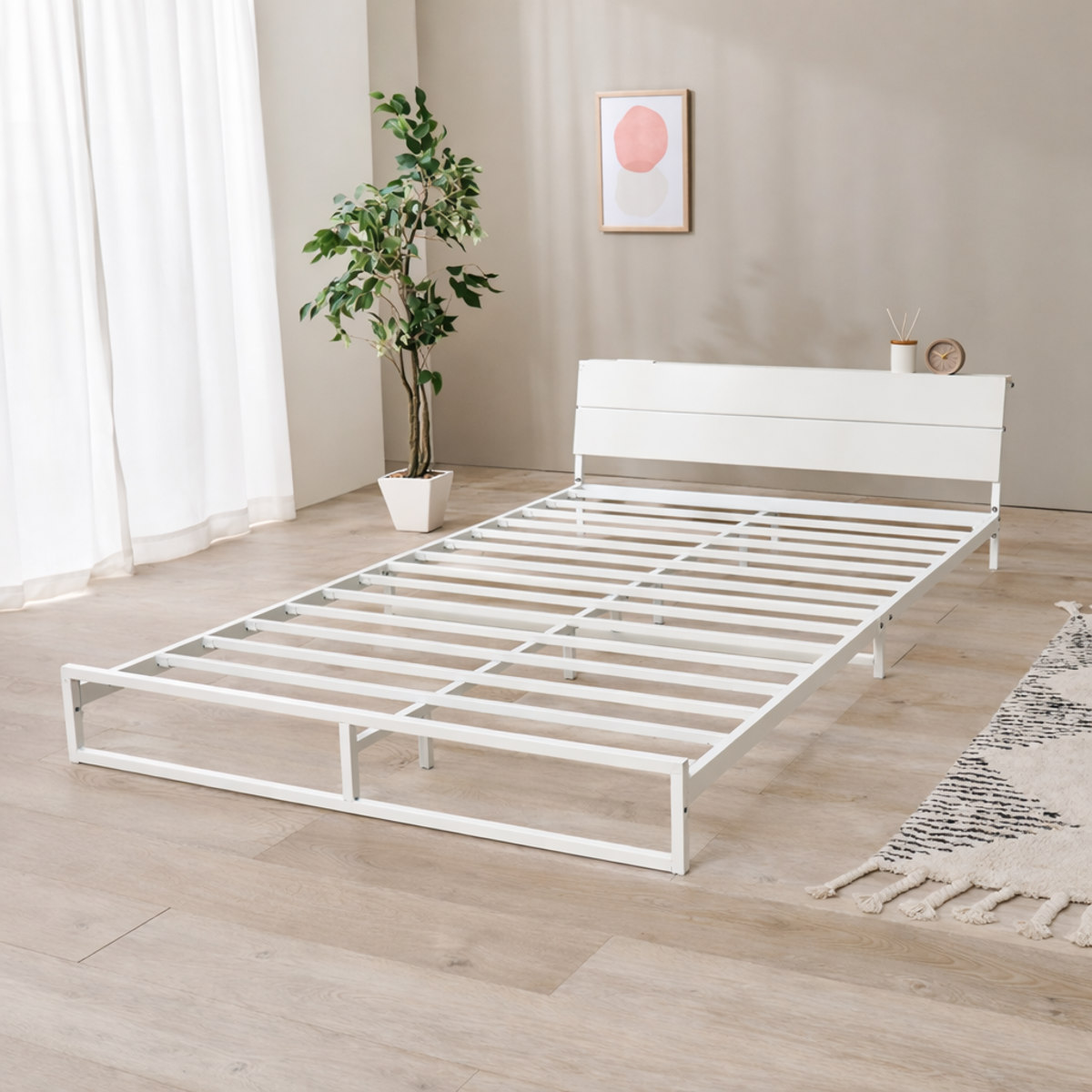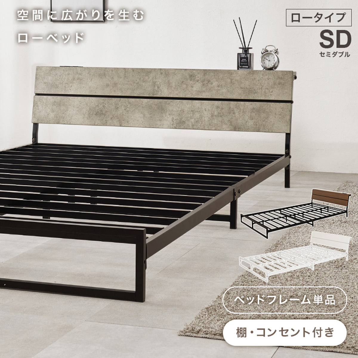 スッキリとした印象のスチールベッド ロータイプ セミダブル