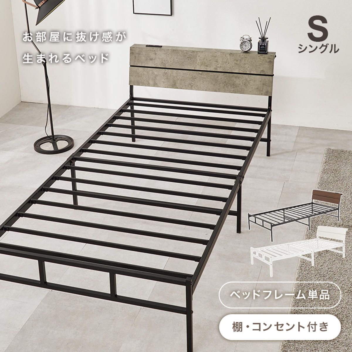 スマホや時計、小物をまとめて置ける便利な宮棚付きです。コンセントはお部屋のレイアウトに合わせて左右どちらにも付け替え可能です。