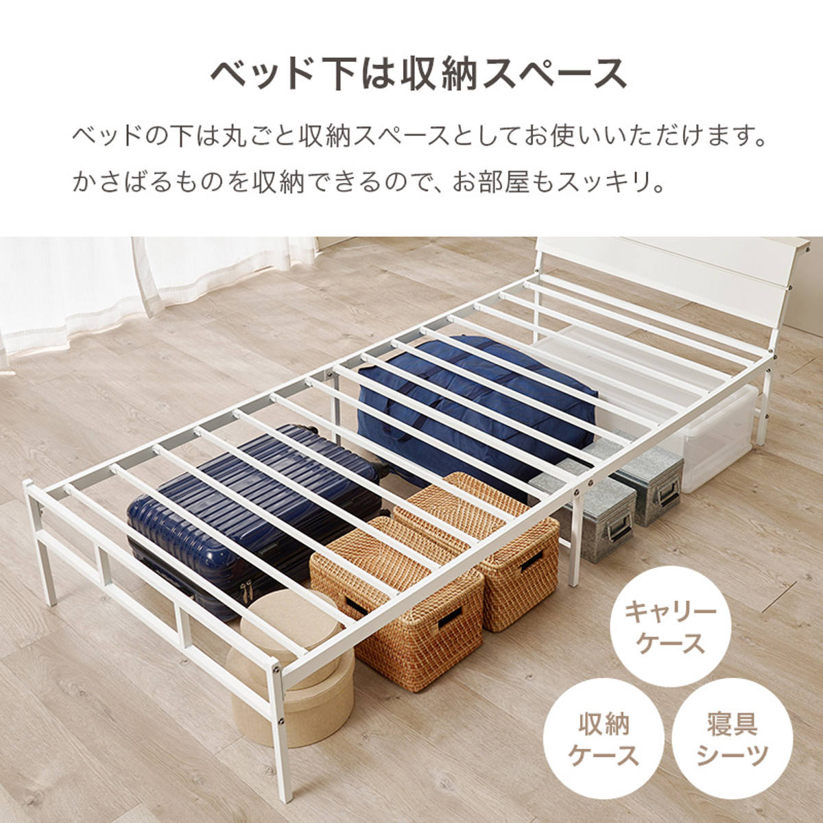 床下の高さが約30.5cmのハイタイプです。ワンルームや子供部屋など、スペースに限りがある場合でも、たっぷりと収納場所を確保できてお部屋をスッキリ保てます。キャリーや季節用品など、使用頻度の低い物の収納場所にもおすすめです。