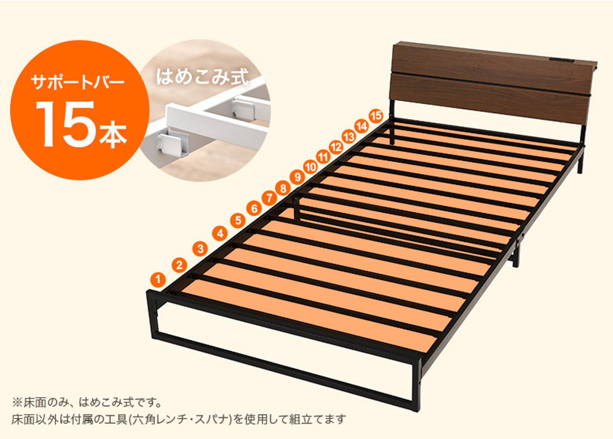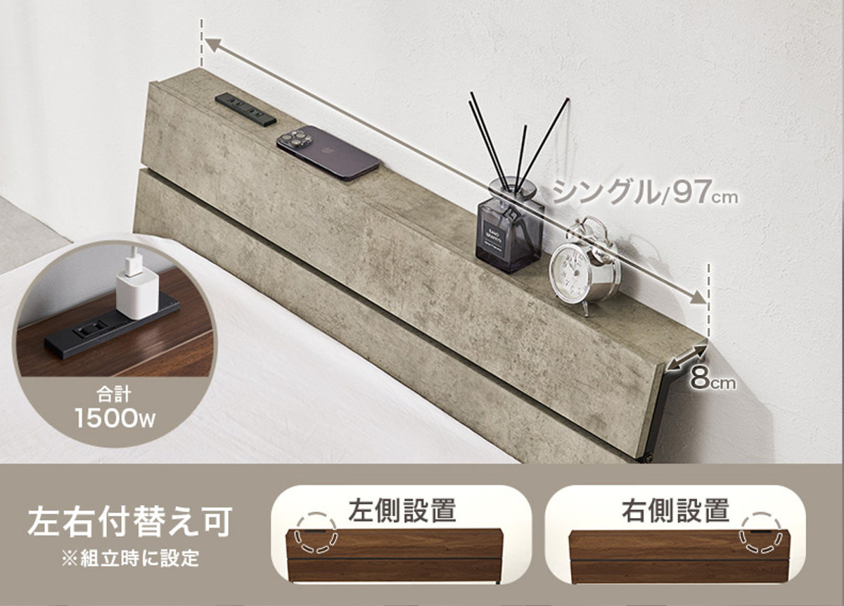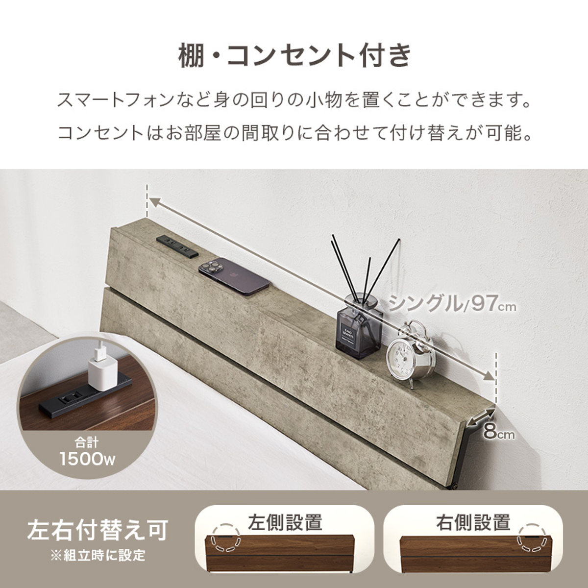 スマホや時計、小物をまとめて置ける便利な宮棚付きです。コンセントはお部屋のレイアウトに合わせて左右どちらにも付け替え可能です。