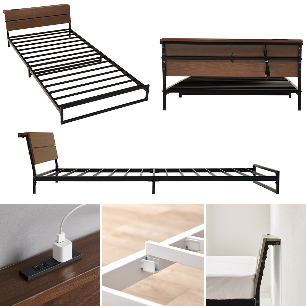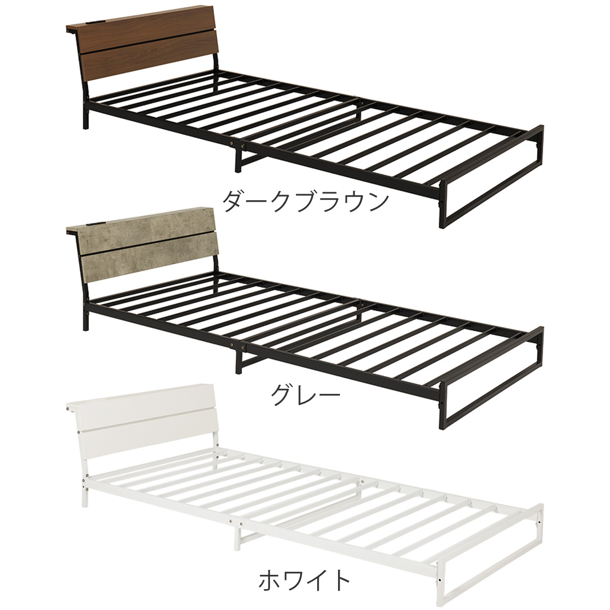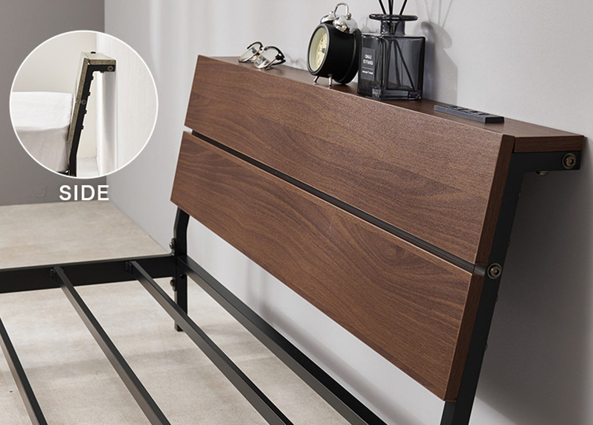 スマホや時計、小物をまとめて置ける便利な宮棚付きです。コンセントはお部屋のレイアウトに合わせて左右どちらにも付け替え可能です。
