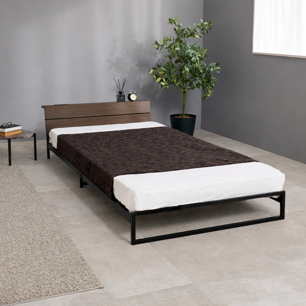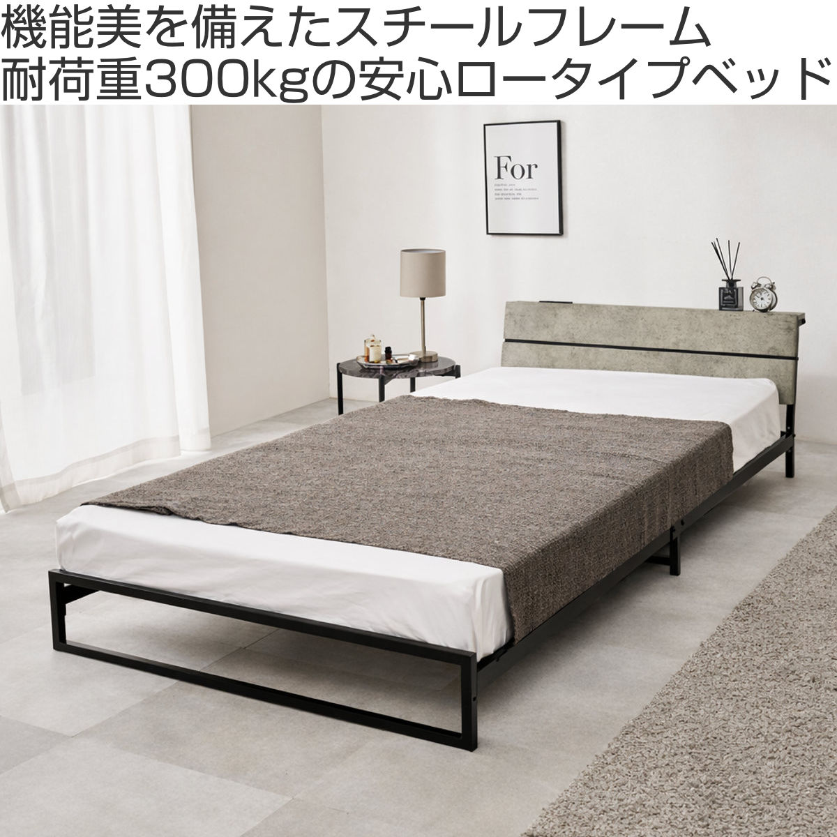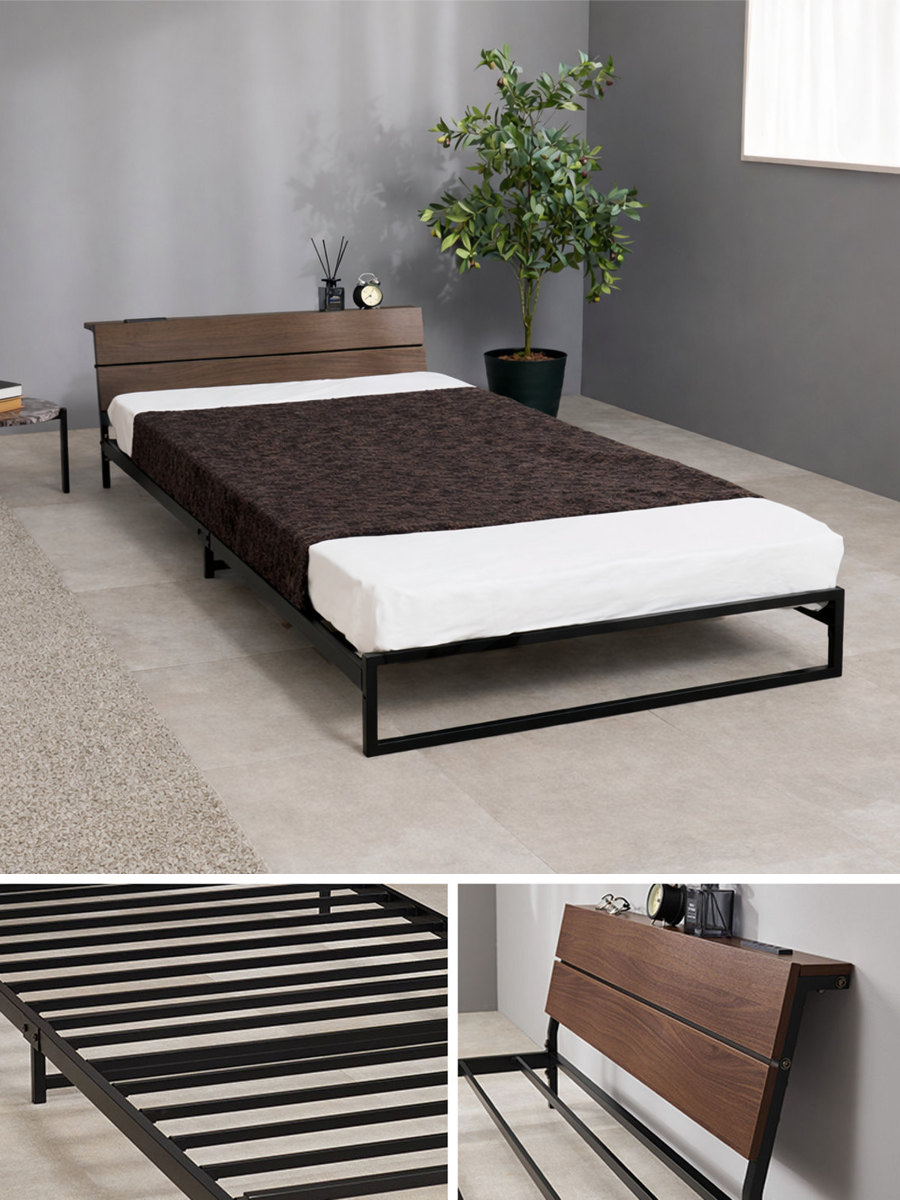 無骨で美しいスチールフレームのロータイプベッドのボンネルコイルマットレス付きです。見た目もすっきり、無駄のない洗練されたデザインがお部屋を広く見せ、インテリアに自然に馴染みます。