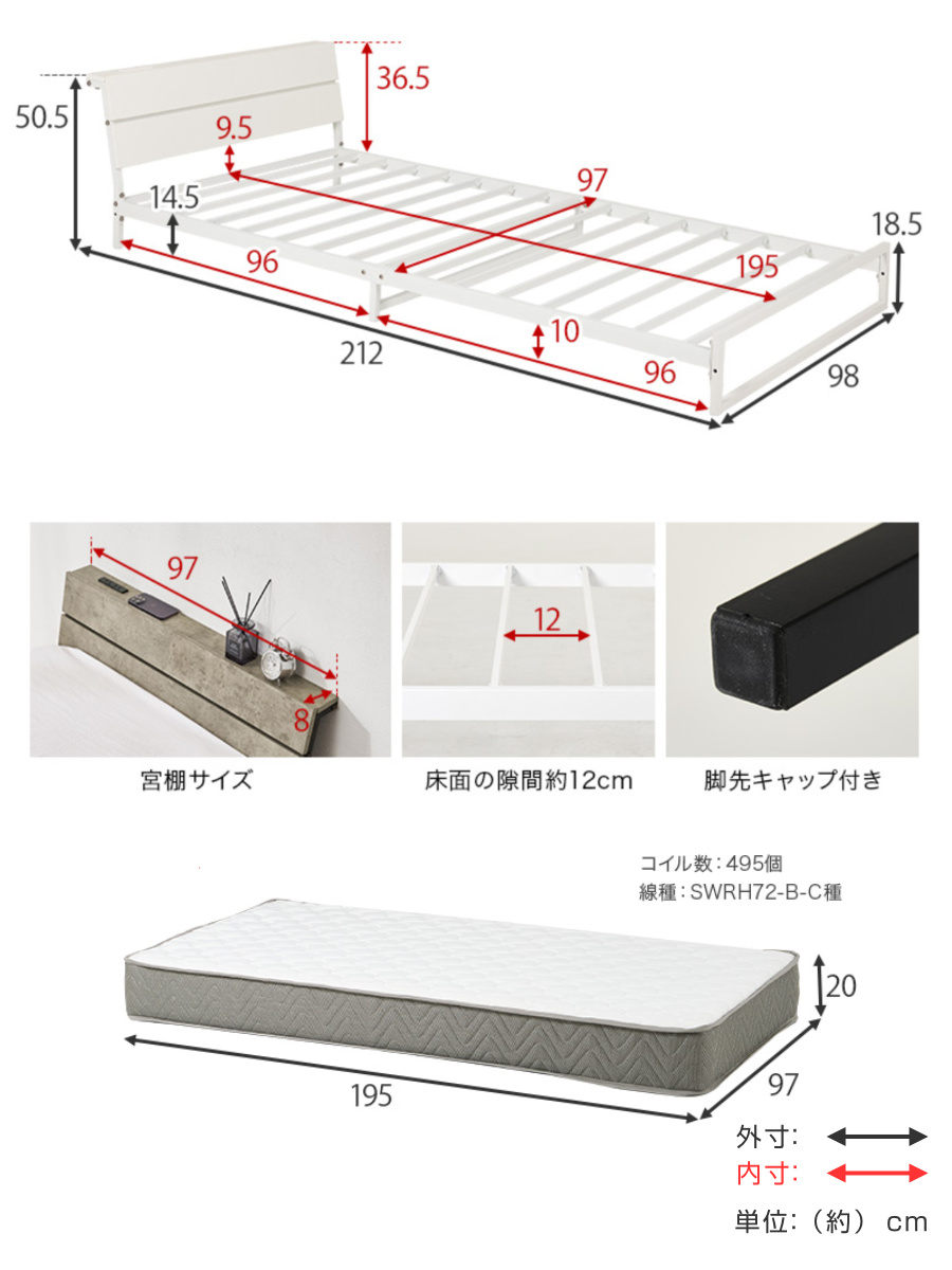 | サイズ | 【ベッド】 約 幅98×奥行212×高さ50.5×床面高14.5(cm) 【マットレス】 約 幅97×奥行195×高さ20(cm) |