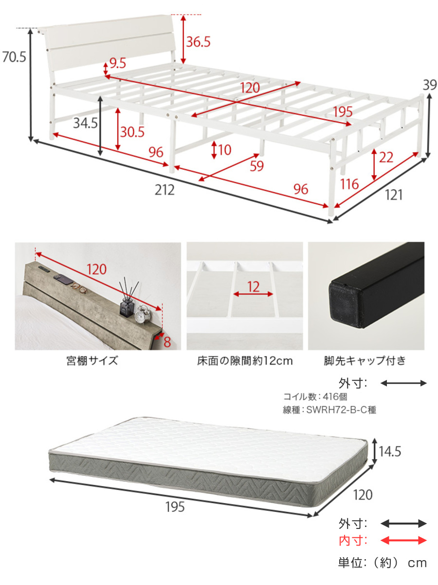 | サイズ | 【ベッド】 約 幅121×奥行212×高さ70.5×床面高34.5(cm) 【マットレス】 約 幅120×奥行195×高さ14.5(cm) |