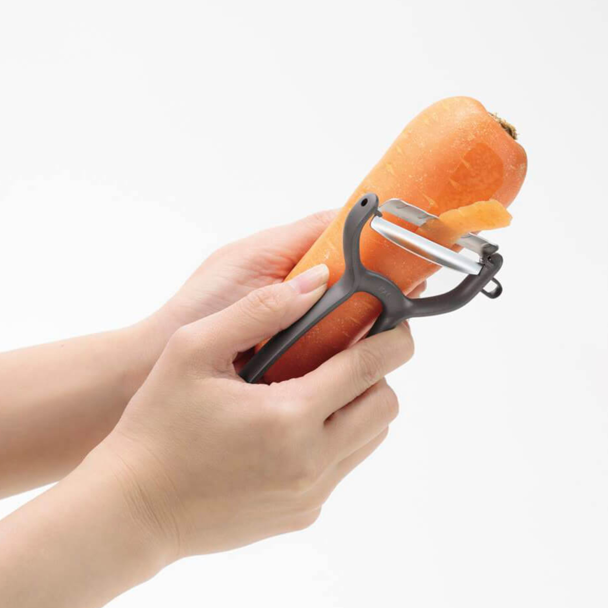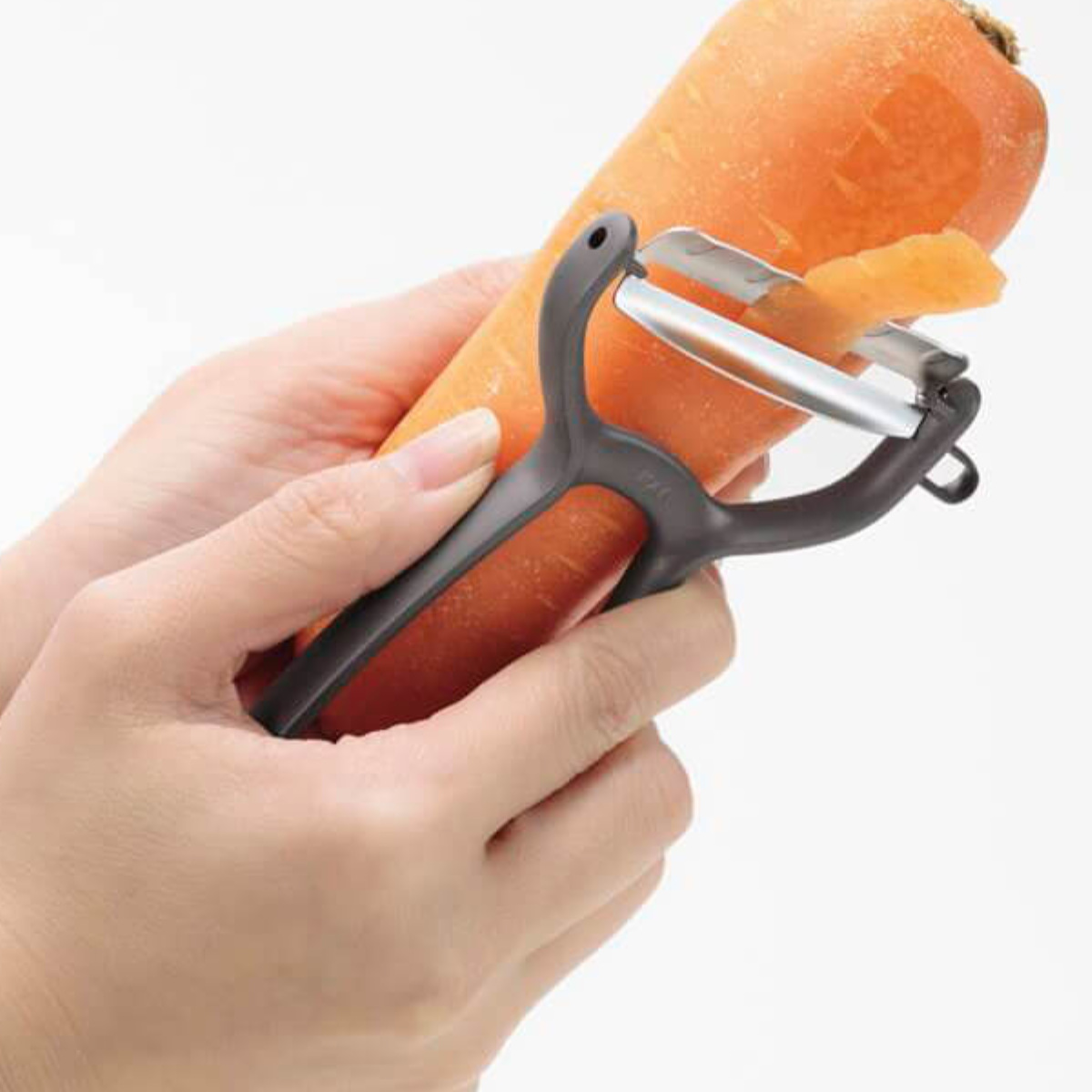 握りやすいハンドル設計で、手にフィットしながら安定して使えるピーラーです。じゃがいもの芽取りも付いているので、ひとつで下ごしらえがスムーズに行えます。