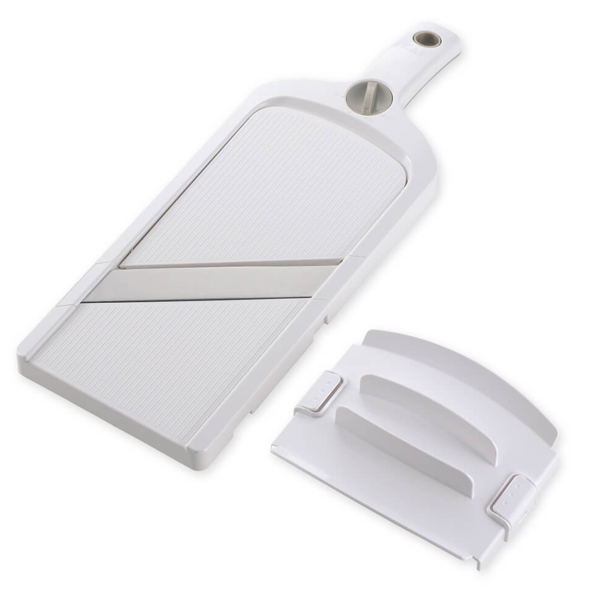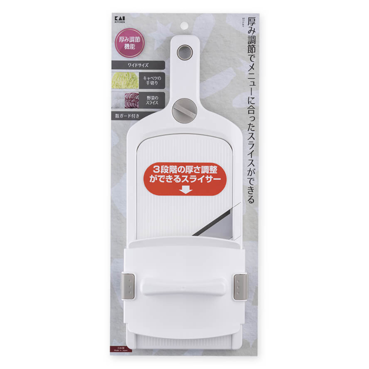 スライスの厚みを調整できる、ワイドタイプのスライサーです。薄・中・厚の3段階に加え、収納時は刃を保護する位置に調整可能です。