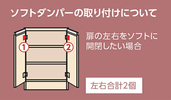 設置したい扉1枚に対してソフトダンパー1個を取り付けます。例えば、2枚扉の左右両方の開閉をソフトにしたい場合には、ソフトダンパーは2個必要です。