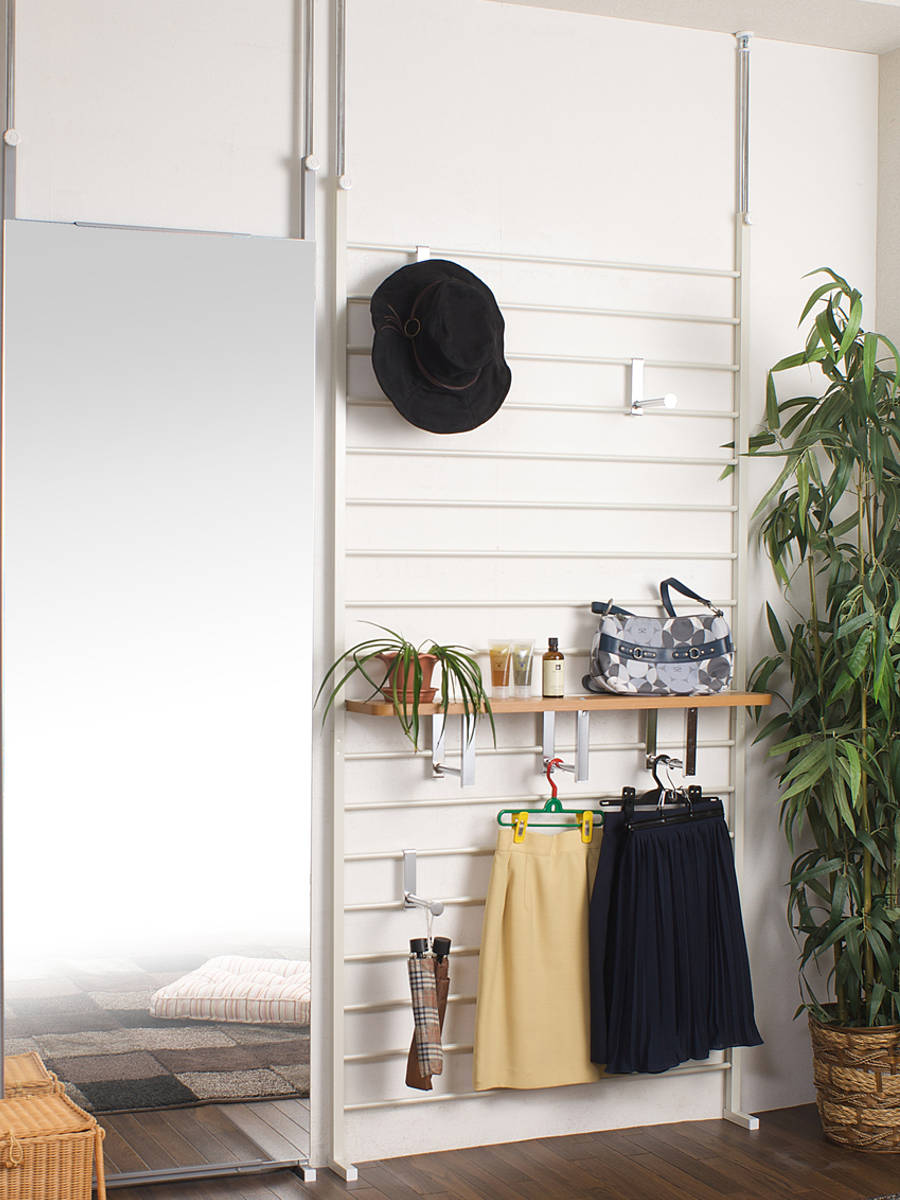 ちょっとした壁面スペースに突っ張り式で簡単に設置できるラダーラックです。掛けると飾る、どちらも楽しみながら収納できるので、インテリアのアクセントにも。天井や壁に穴を空けるなどの工事が不要なので、賃貸住宅にお住まいの方にもおすすめです。