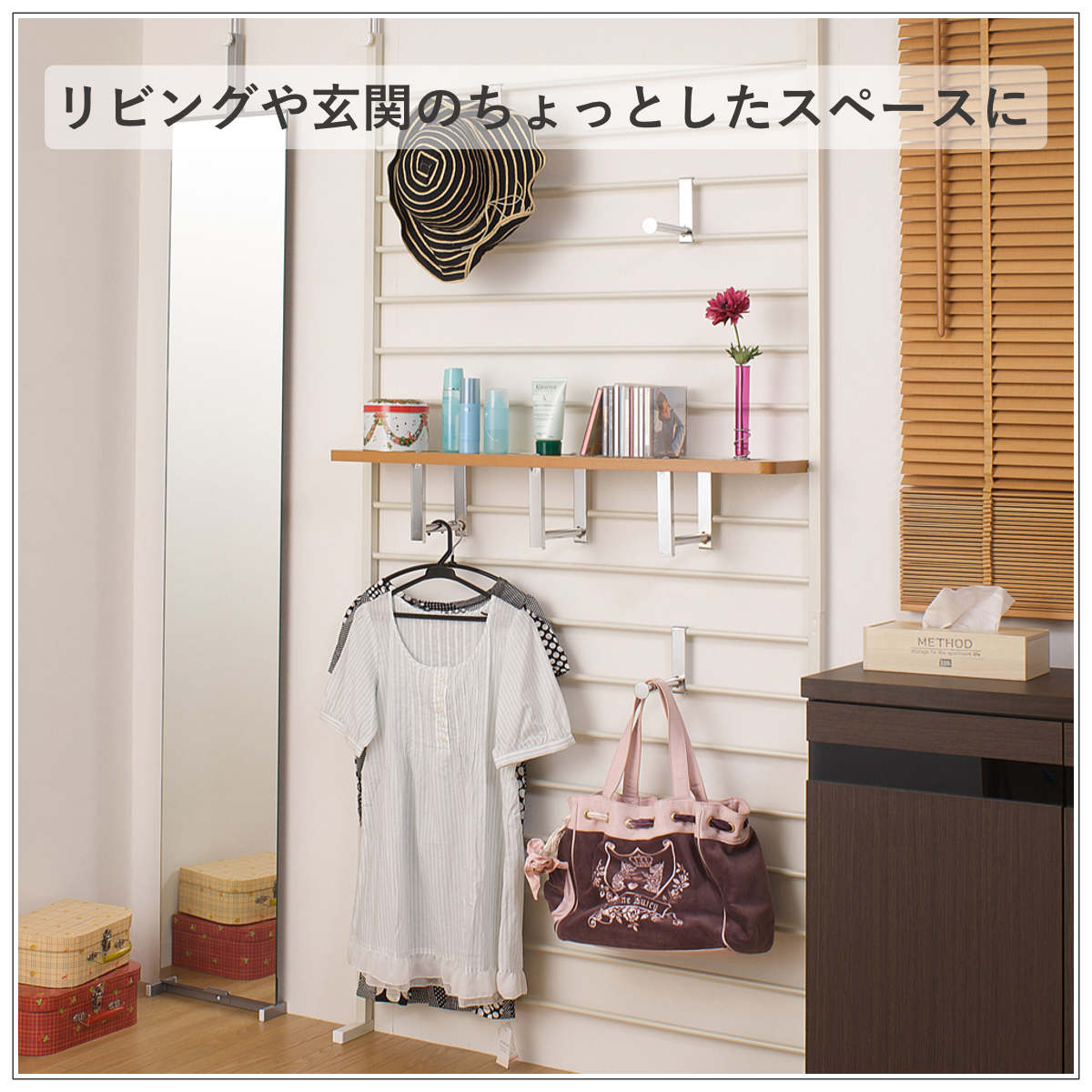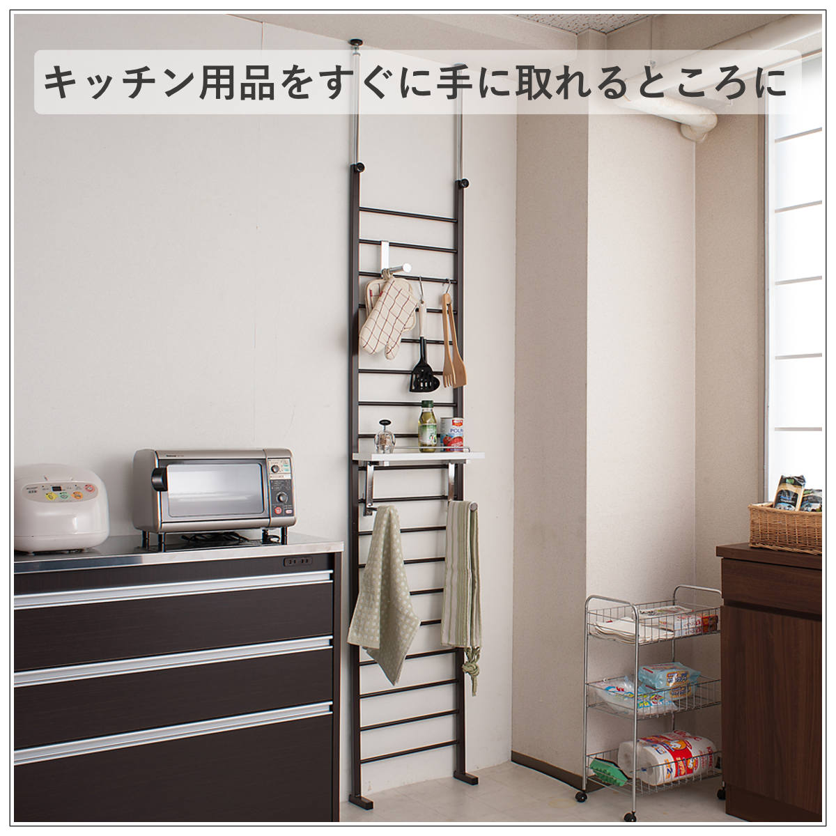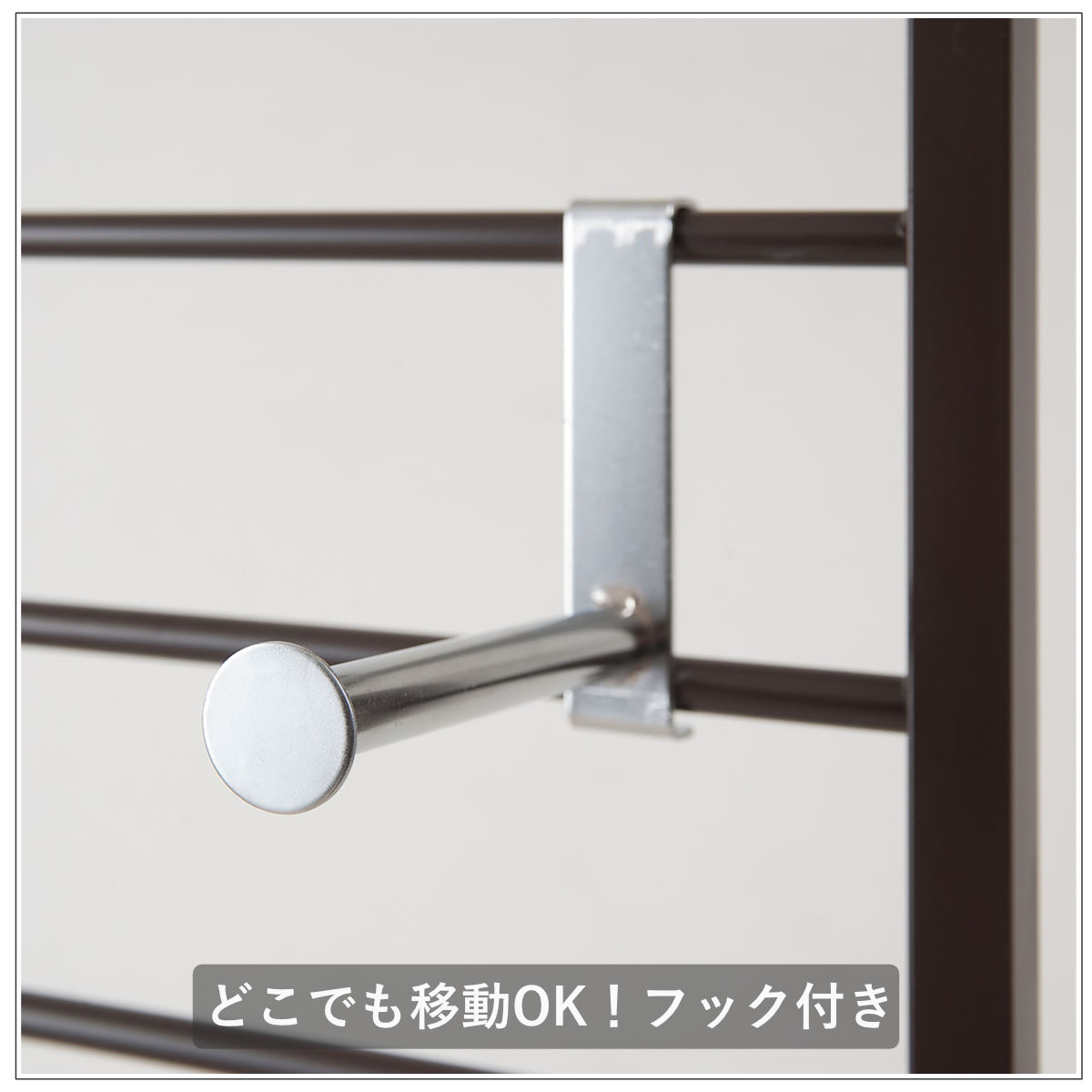 | サイズ | 本体:約 幅95×奥行20×高さ200~260(cm) 棚板サイズ:約 幅89.5×奥行17.5×厚み2(cm) フック出幅:約14cm 棚板可動間隔:約8.5cm |