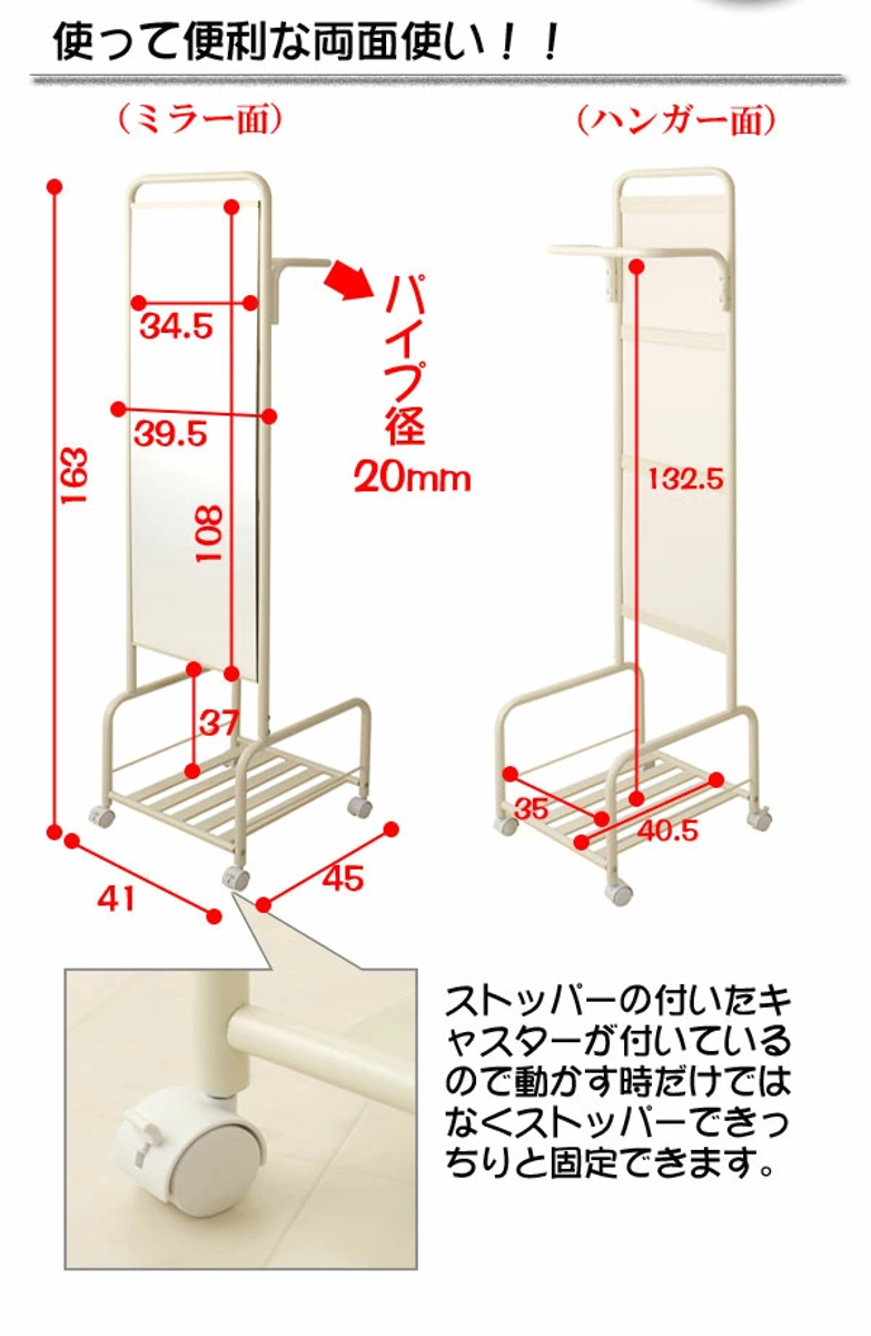 ●片面はミラー、もう片面はハンガーラックで、両面便利にお使いいただけます。