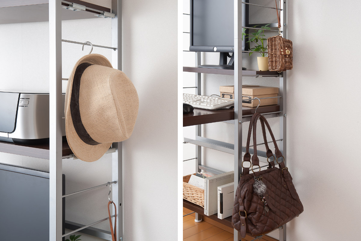 側面のラダー部分にはS字フックなどを使って、かばんなどを掛けることができます。