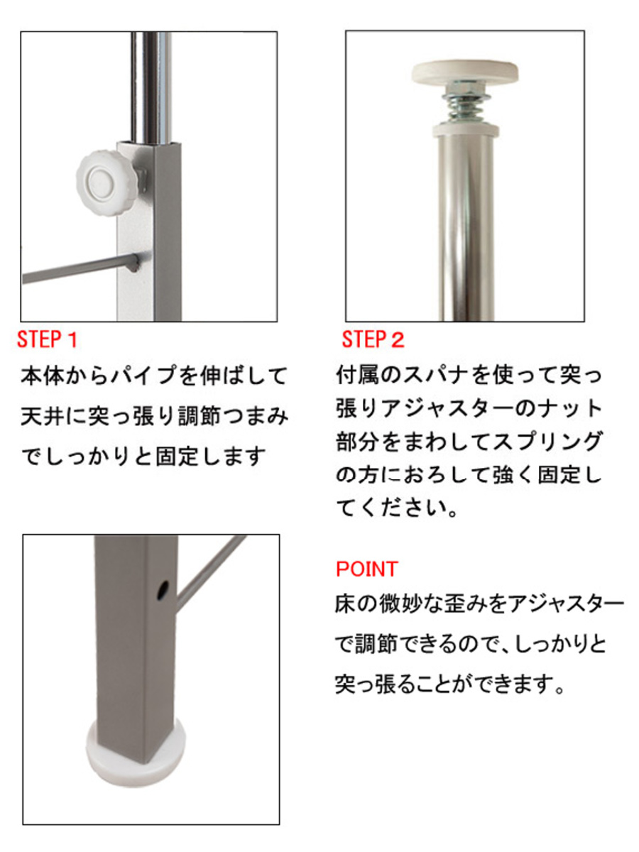 本体の設置は突っ張り式で簡単に設置ができます。また、脚部はアジャスター付きで、調節することで床の傾きや凸凹によるガタつきを軽減できます。