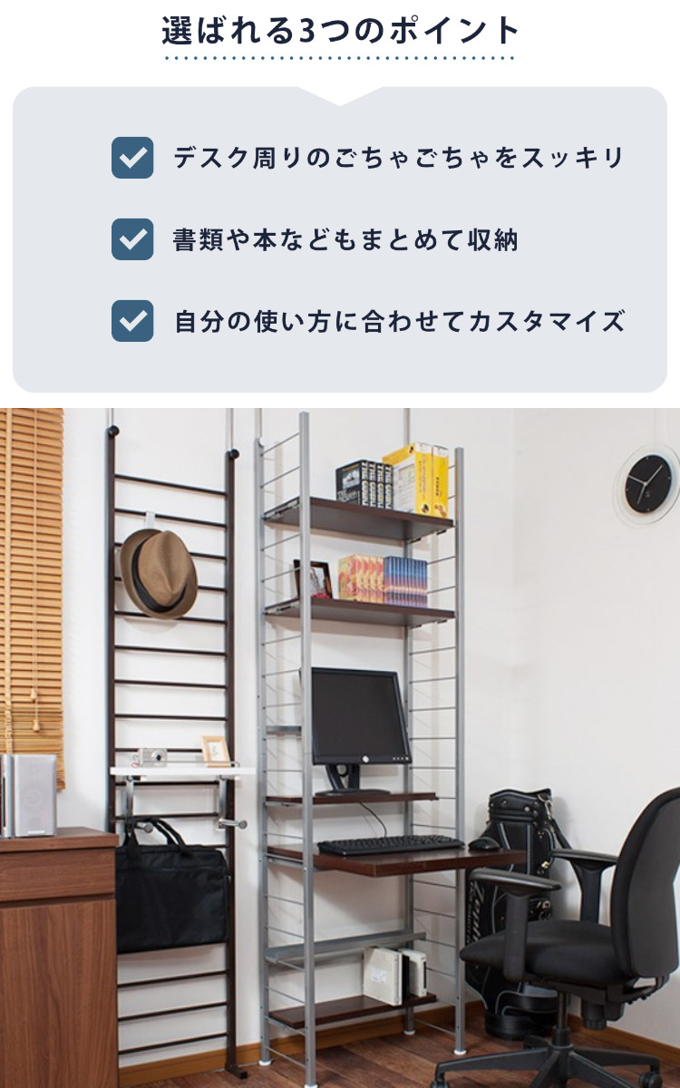 突っ張り式で簡単に設置できるデスクは、天板と棚板の位置が変えられるスグレモノです。さらに別売りの棚板を追加することにより、収納を増やしたり、2台を連結することもできます。