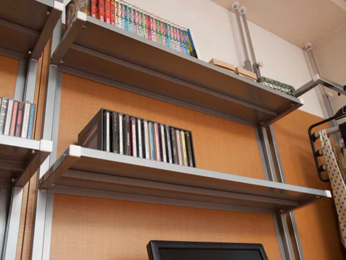 棚板の裏には補強の桟が入っているので、増えていくDVDや書籍もしっかり収納できます。
