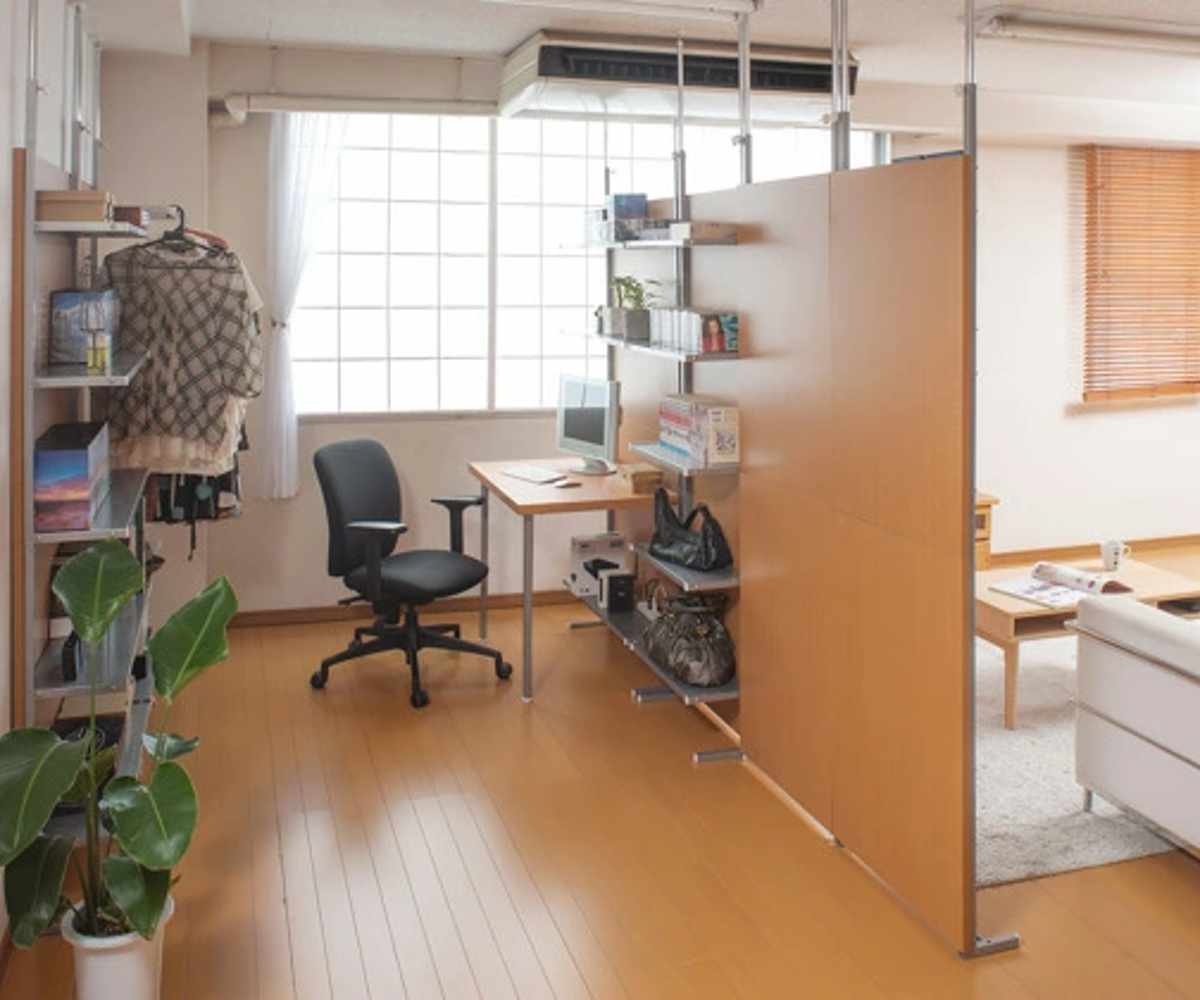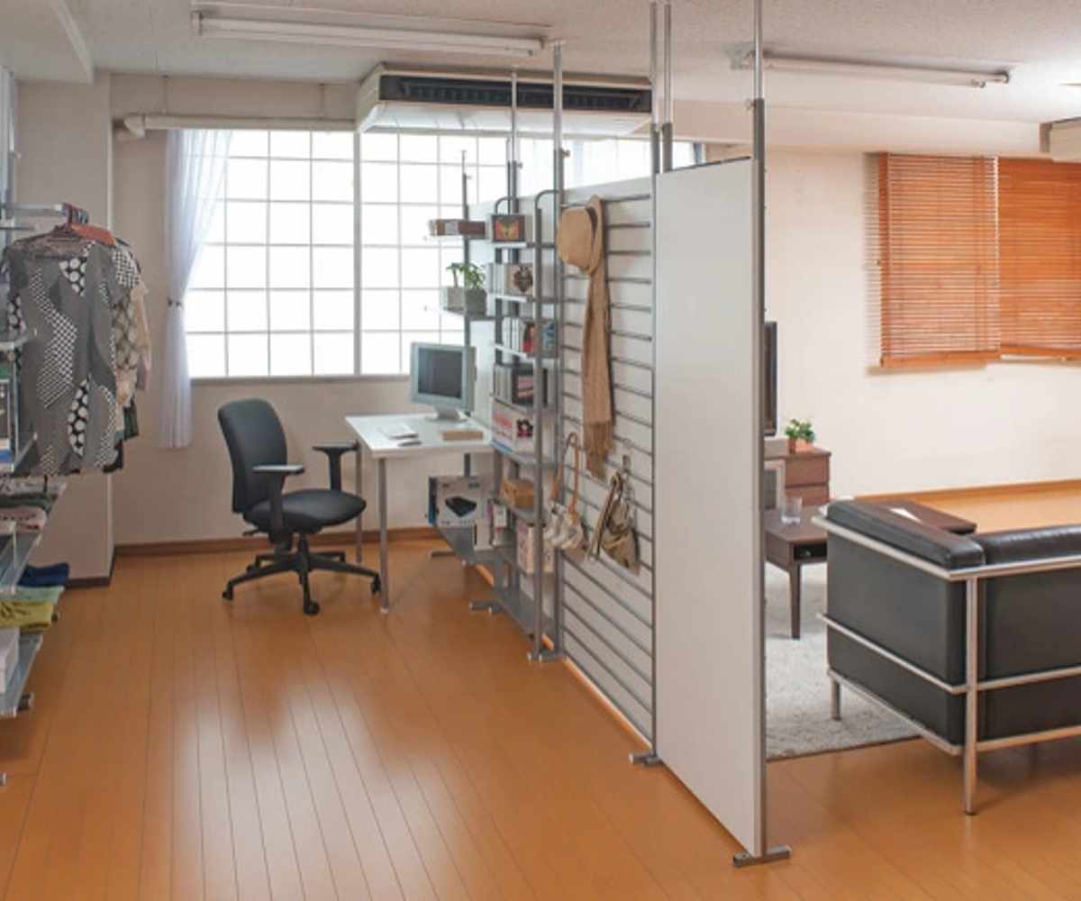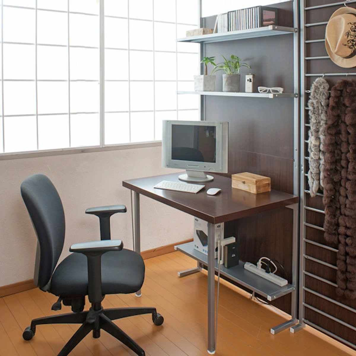 間仕切りパーテーションとしても使えるワークデスクです。床と天井で支えるので安定感があり、穴を開けずにしっかりと固定してくれます。
