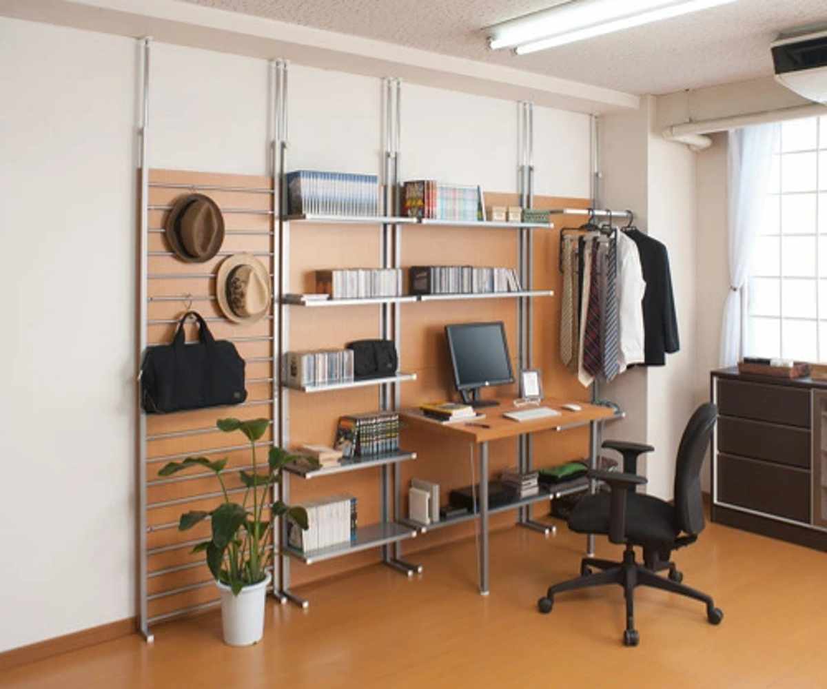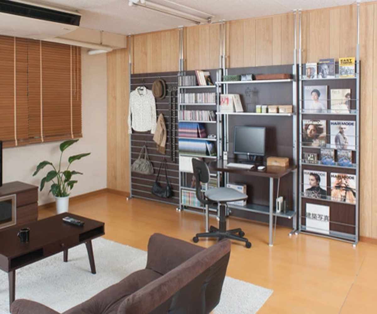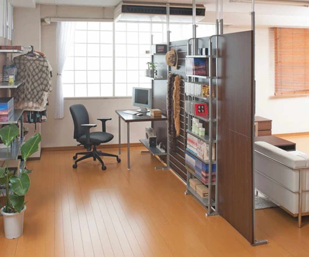 間仕切りパーテーションとしても使えるワークデスクです。床と天井で支えるので安定感があり、穴を開けずにしっかりと固定してくれます。