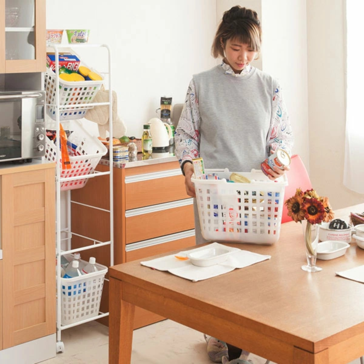 ペットボトルやラップ、お菓子などモノが溢れるキッチンでも大活躍。そのまま取り出すことも、バスケットごとテーブルに持って行くこともできます。