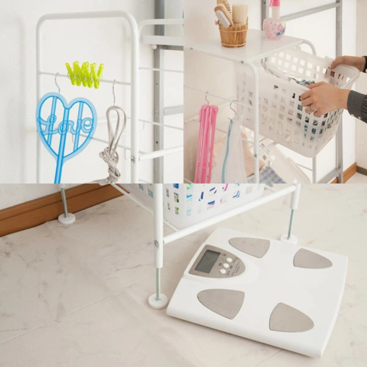 下部にヘルスメーターを置けるスペースがあります。サイドには、フックでいろいろな物が掛けられます。バスケットも取り出しやすくて、コンパクトなのに多機能◎