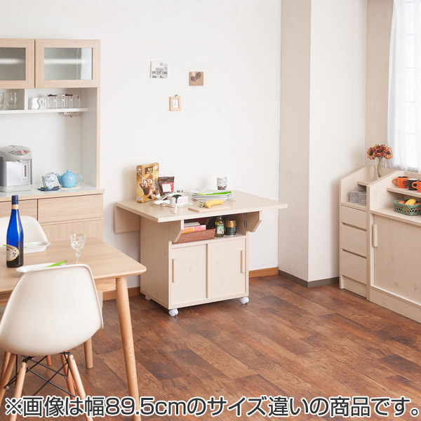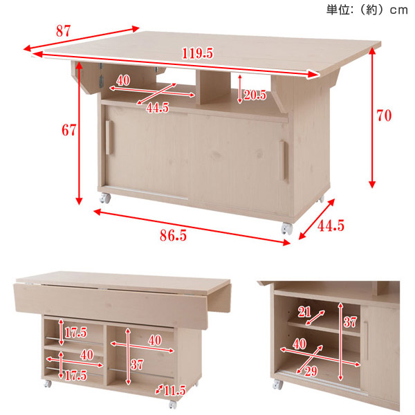| サイズ | 本体:約幅119.5×奥行(閉じ時)55(片バタ時)71(両バタ時)87×高さ70(キャスター含)(cm) 天板下オープン部(左右共通):約幅40×奥行44.5×高さ20.5(cm) 裏面オープン部:約幅40×奥行11.5×高さ(左上+左下各)17.5(右)37(cm) 扉部内寸(左右共通):約幅40×奥行29×高さ37(可動棚奥行21)(cm) |