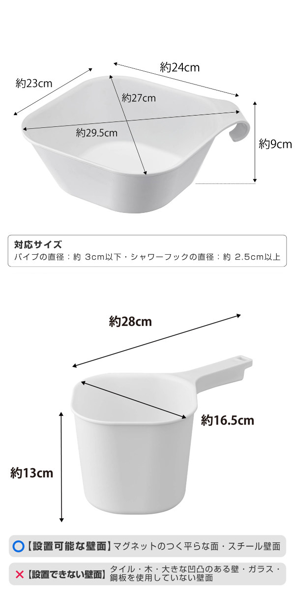 | 対応サイズ | 【湯おけ】 パイプの直径/約3cm以下、シャワーフックの直径/約2.5cm以上 |