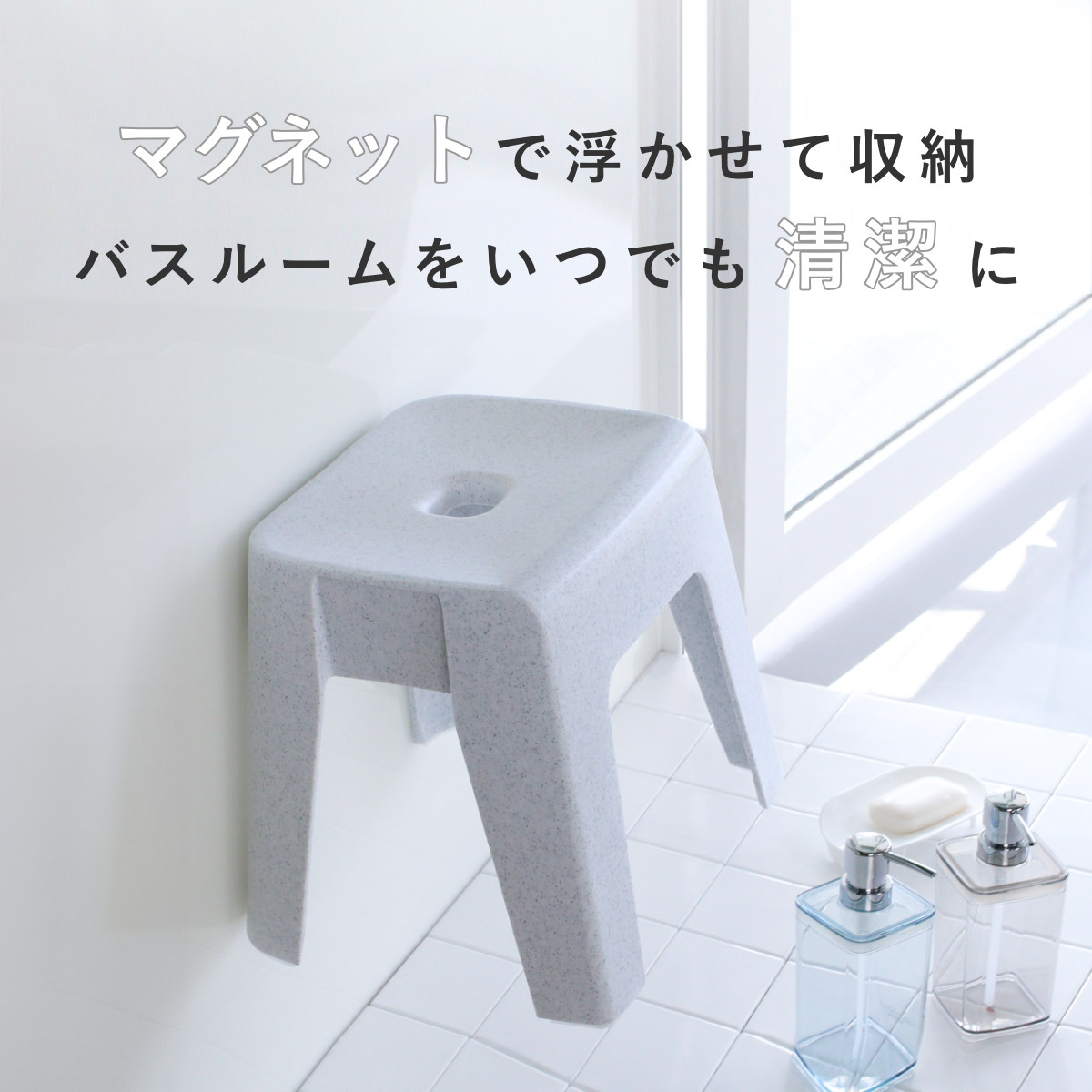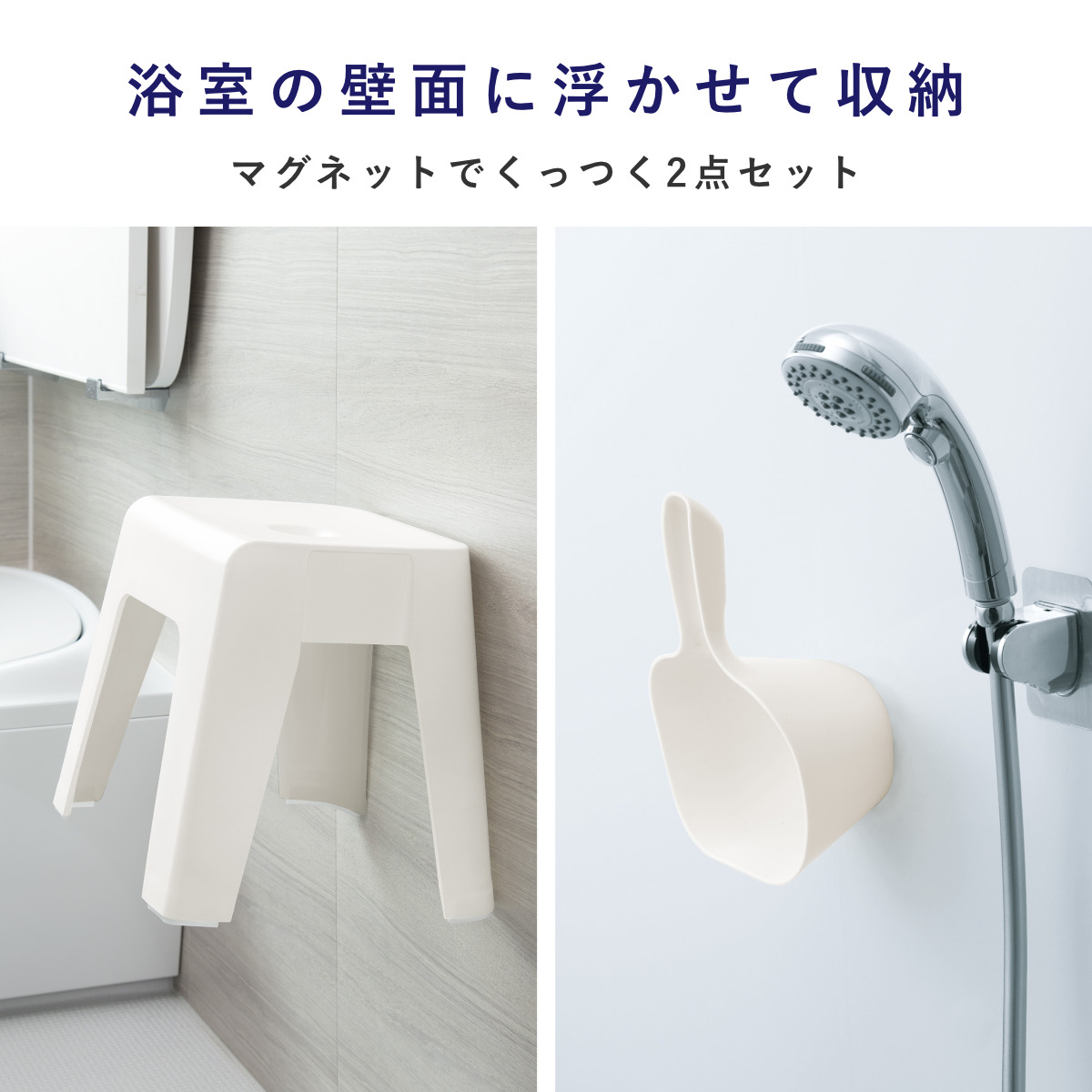 浴室の壁面にマグネットで浮かせて収納できる、風呂椅子と手桶のセットです。床に直接置かないことでヌメリや水垢が付くのを防ぎ、清潔に収納できてお掃除も簡単です。