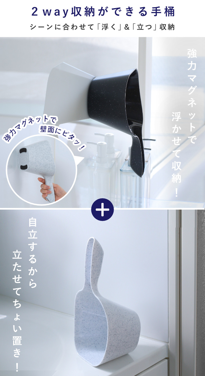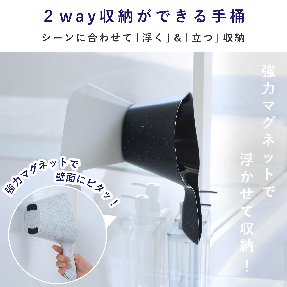 「浮く」&「立つ」収納ができる手桶です。マグネットで浮かせることで水切れが良くなり、早く乾きます。また、側面の一部分がフラットになっているため、スペースを取らずにちょい置きもできます。シャワー中の水が溜まらず衛生的です。