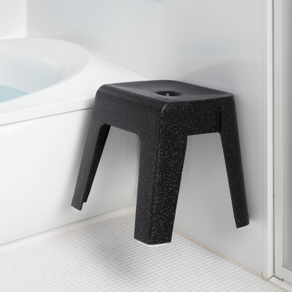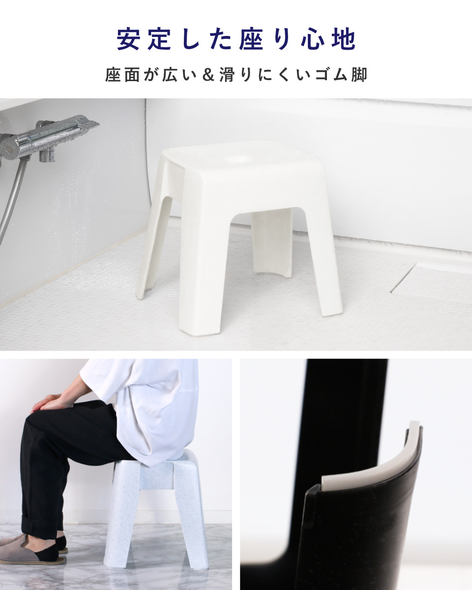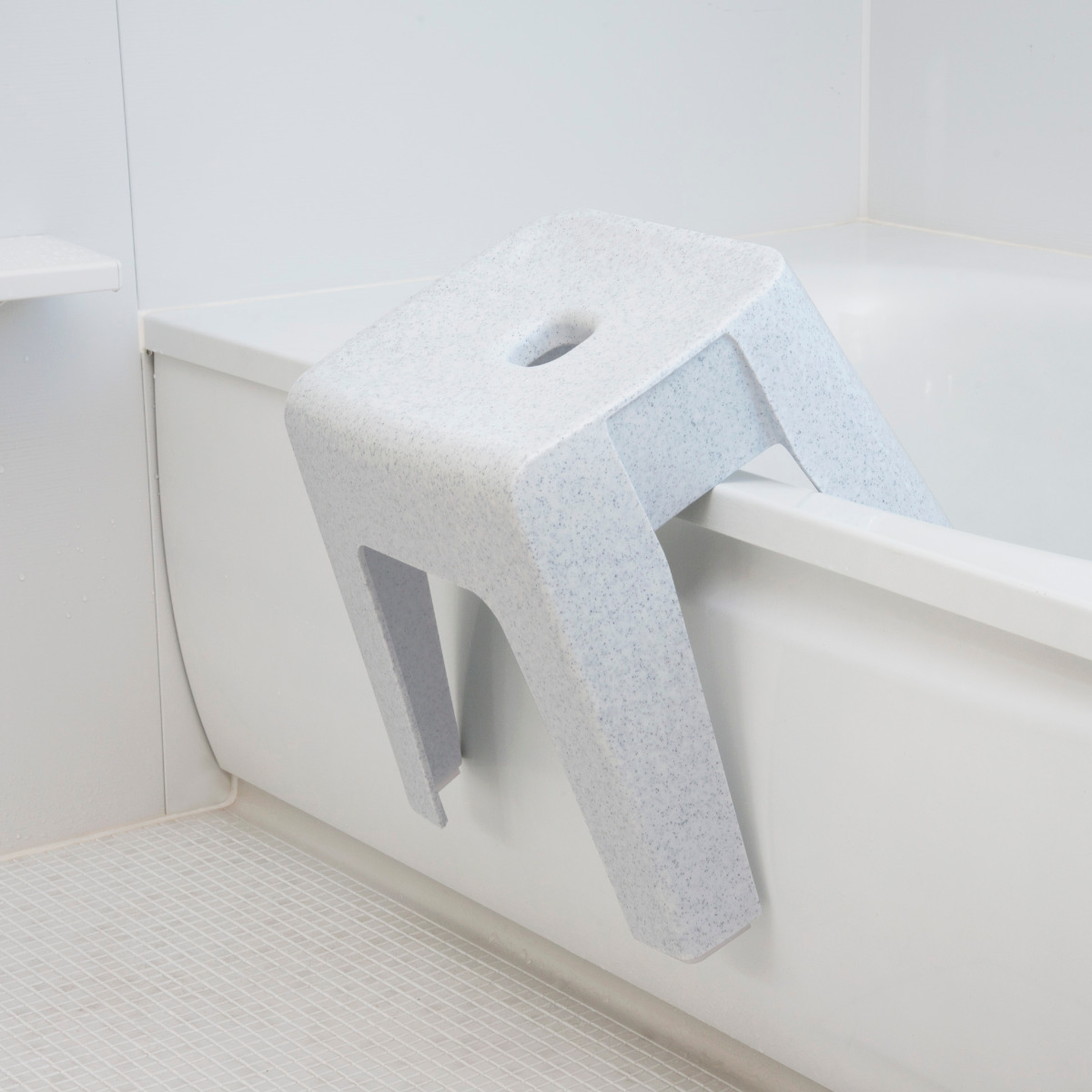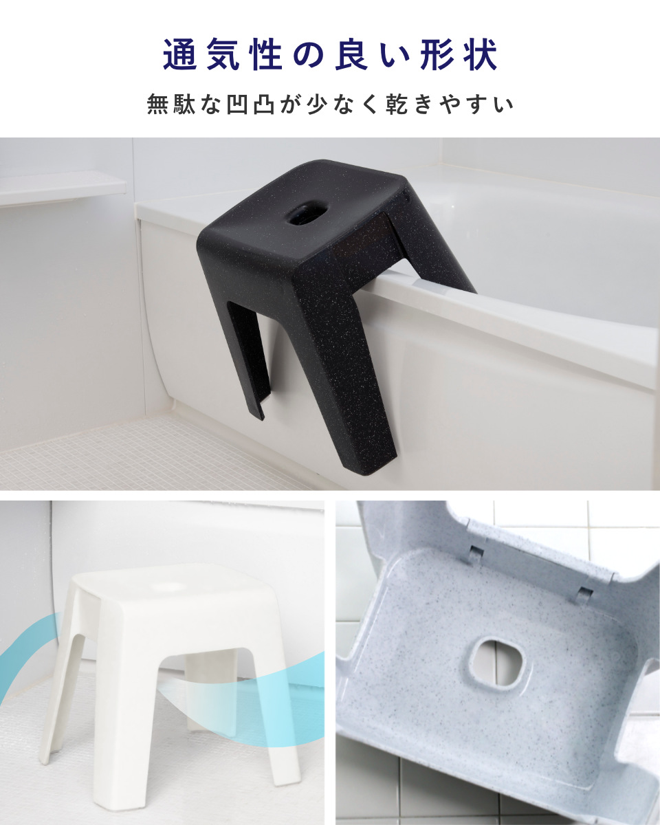 風が通る通気性の良い形状の風呂椅子は、浴槽に引っ掛けて乾かすこともできます。裏面はムダな凹凸が少ないためお手入れも簡単です。