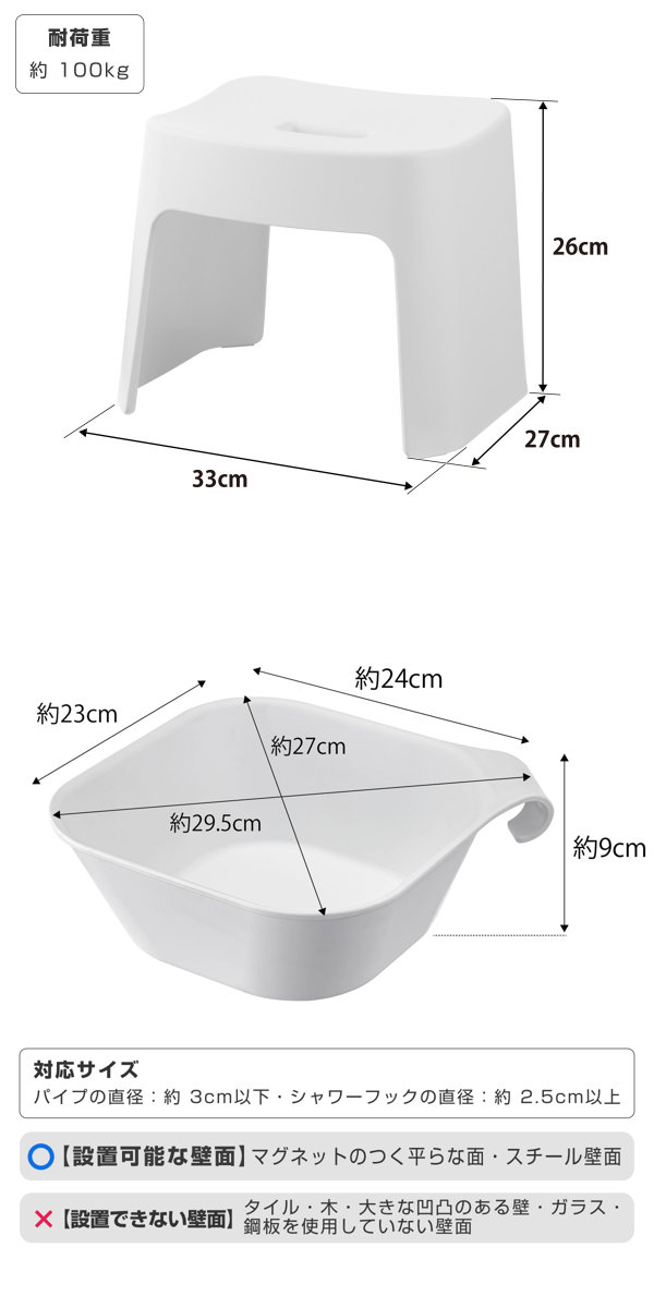 | 対応サイズ | 【湯おけ】 パイプの直径/約3cm以下、シャワーフックの直径/約2.5cm以上 |