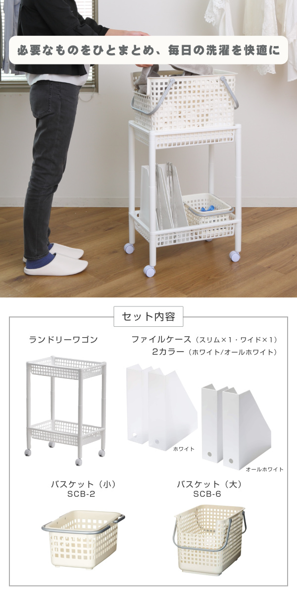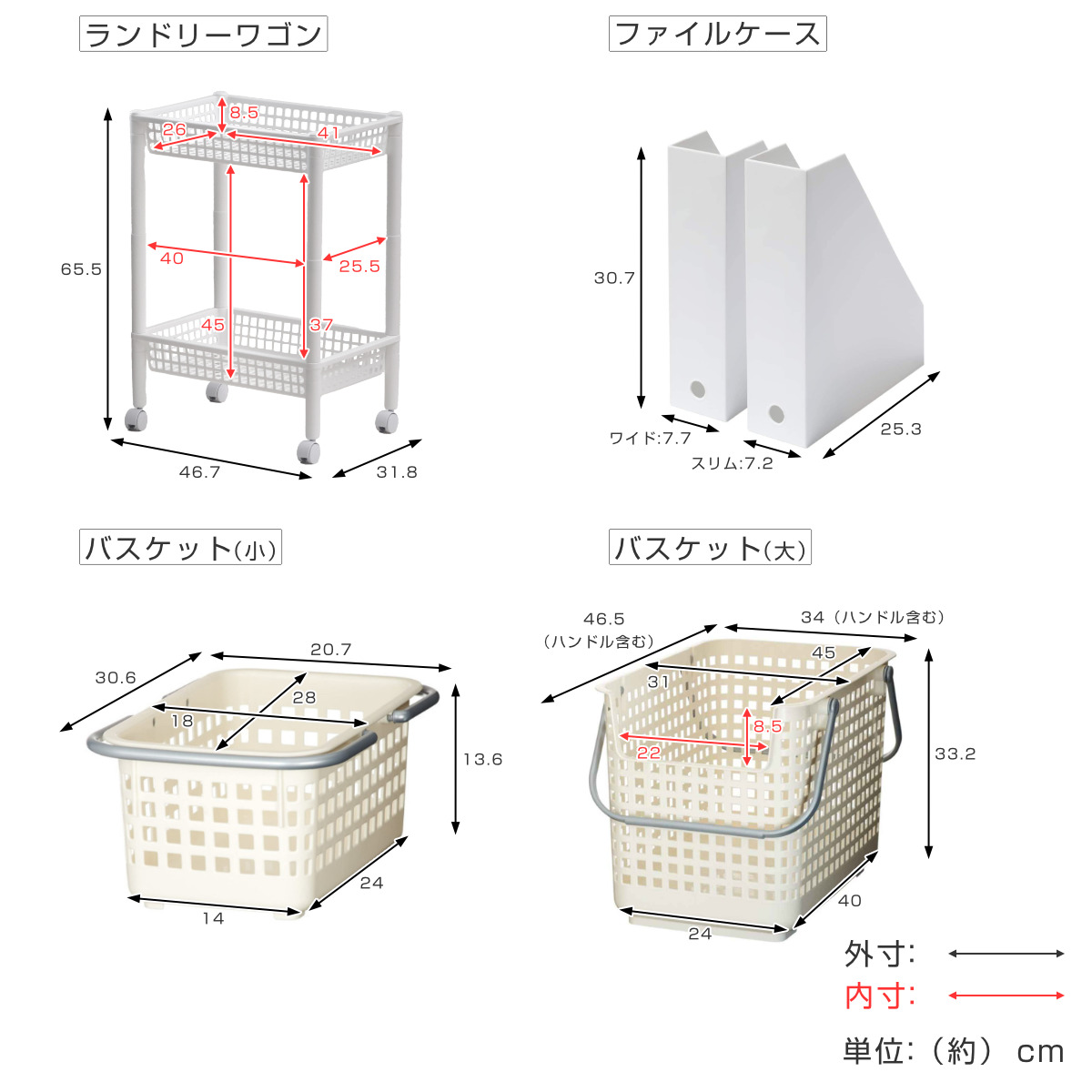 | 内容量 | 4点セット (ランドリーワゴン、ファイルケース(スリム×1、ワイド×1)、バスケット(小)、バスケット(大)) 付属品:インデックスシール |