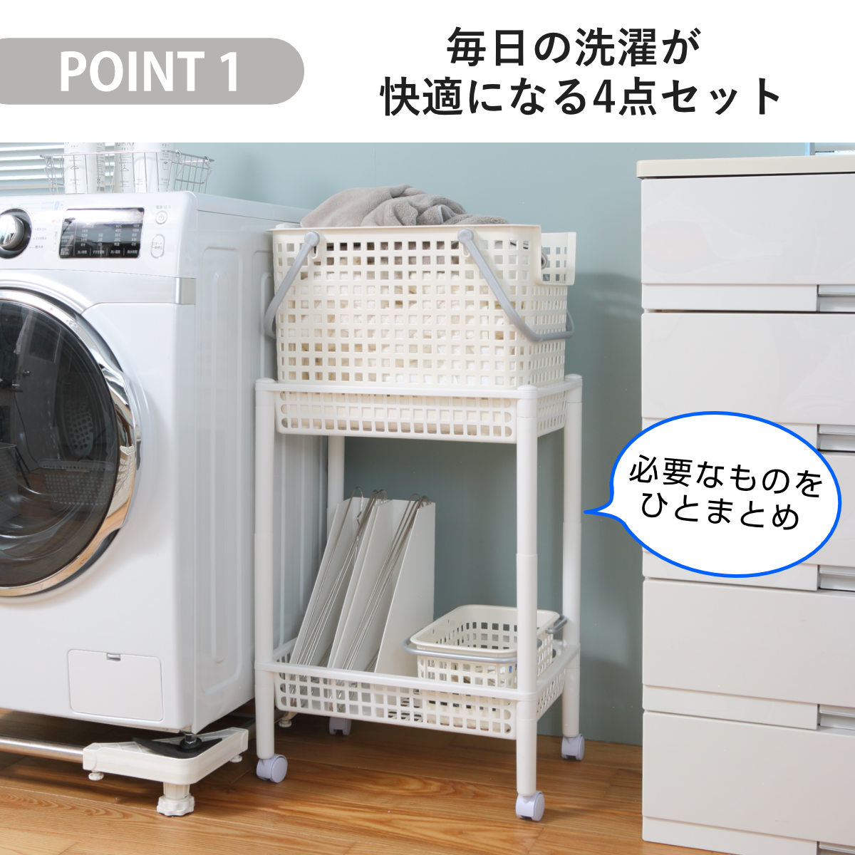 必要なものをまとめて収納できる4点セットです。ランドリーワゴン・ファイルケース・バスケット(小・大)が揃っており、洗濯まわりのアイテムをすっきり整理できます。ホワイトを基調としたシンプルなデザインで、清潔感のある空間を演出します。