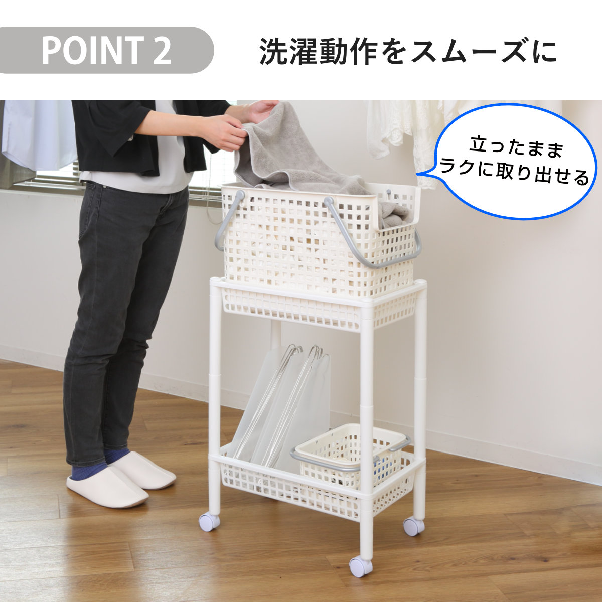 上段にバスケットを配置することで、立ったまま洗濯物を取り出すことができ、干すときはもちろん、洗濯機からの取り出しもスムーズに行えます。腰をかがめる動作が減り、毎日の洗濯がより快適になります。