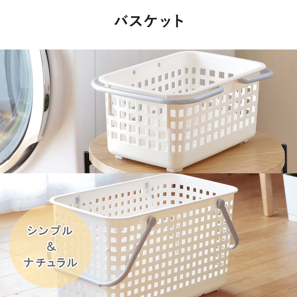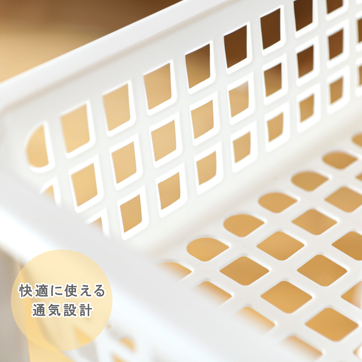 シンプルでナチュラルなデザインのバスケットです。軽くて扱いやすいプラスチック製で、格子状のデザインが風通しの良さを保ちます。