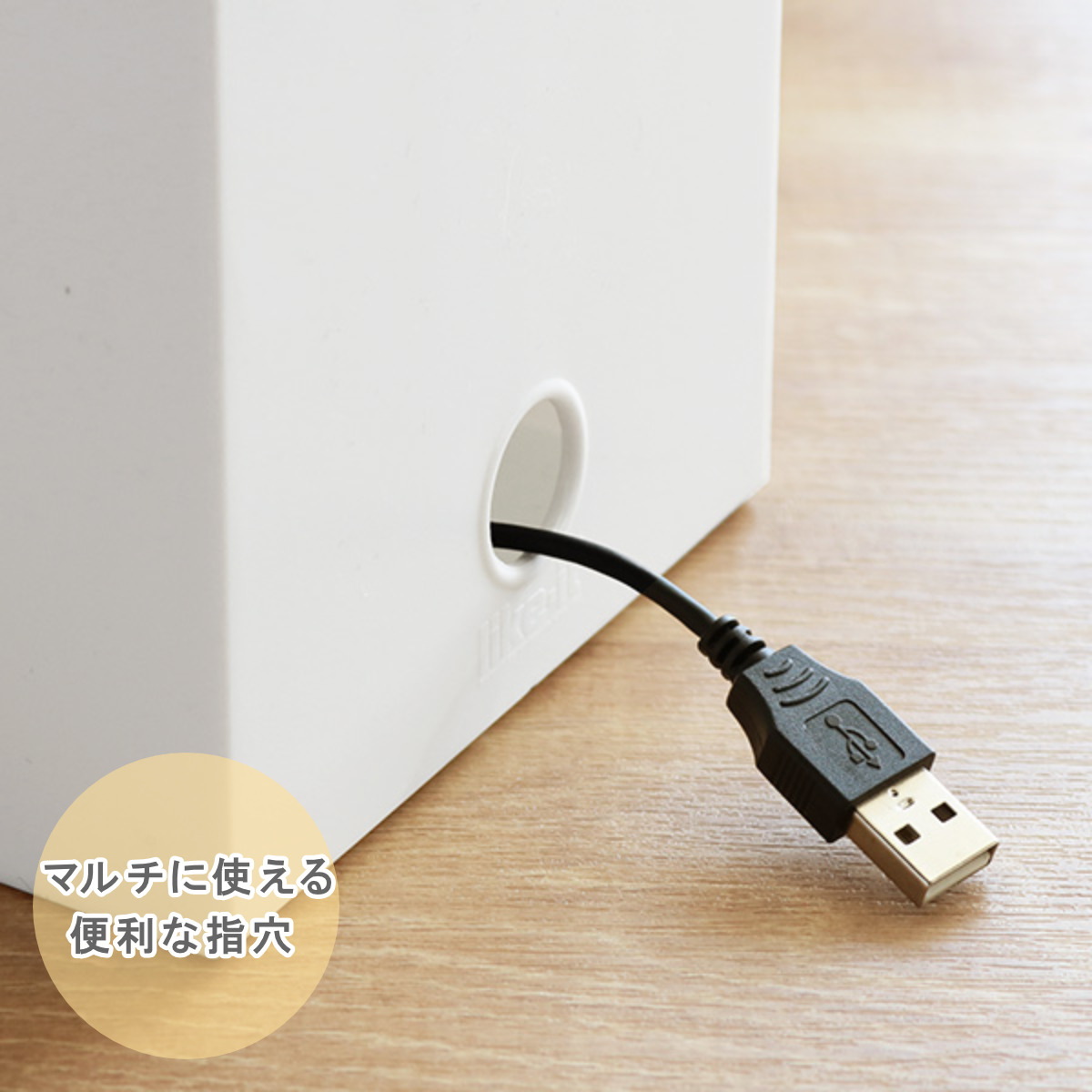 指穴はサイドではなく背板のみに2か所設けられており、縦置き・横置きのどちらの向きでも使える設計です。指を掛けて引き出しやすいのはもちろん、USBケーブルを通すなど、工夫次第で便利にお使いいただけます。