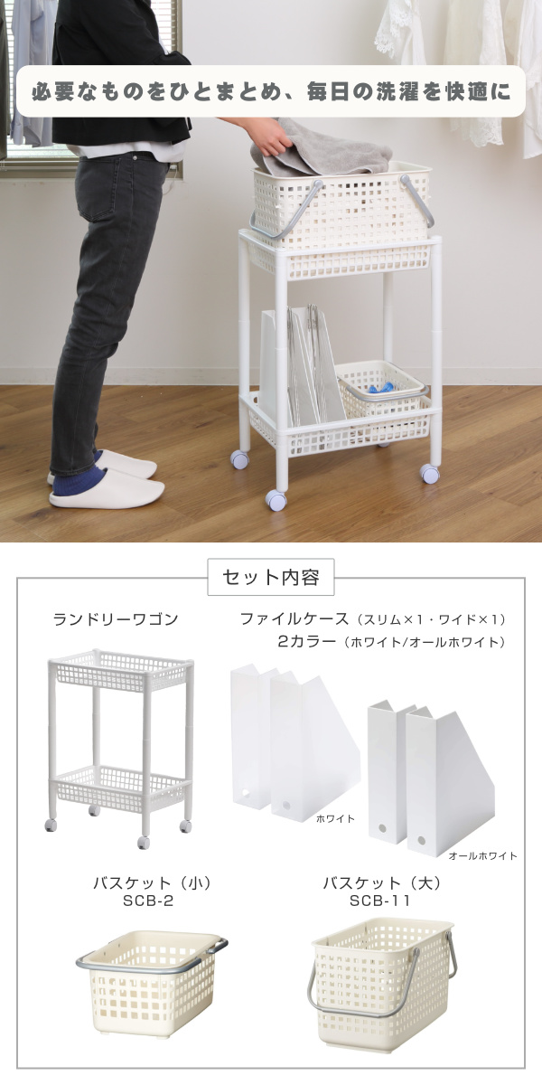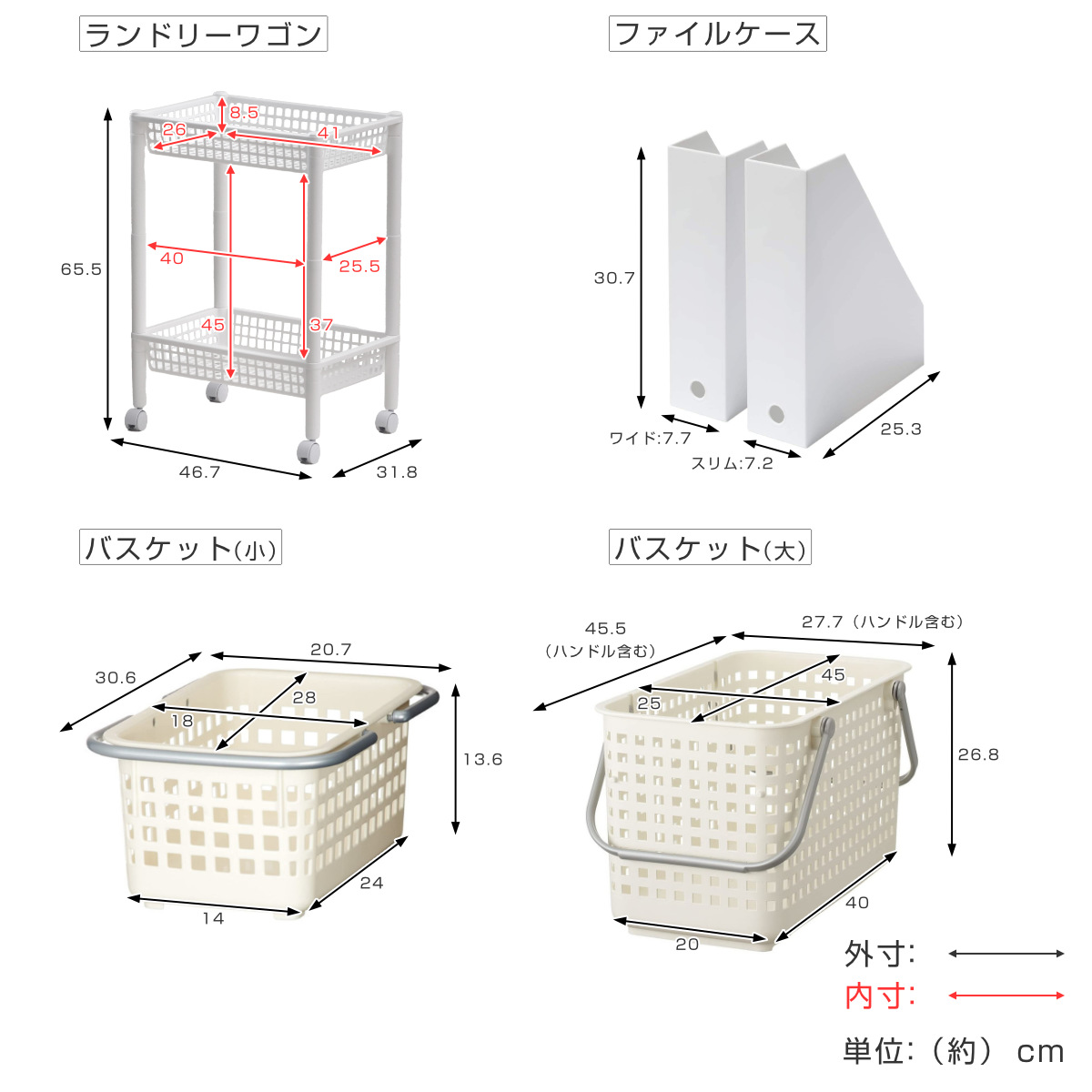 | 内容量 | 4点セット (ランドリーワゴン、ファイルケース(スリム×1、ワイド×1)、バスケット(小)、バスケット(大)) 付属品:インデックスシール |