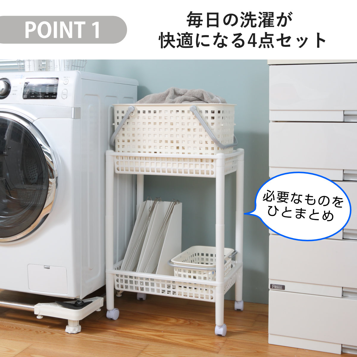 必要なものをまとめて収納できる4点セットです。ランドリーワゴン・ファイルケース・バスケット(小・大)が揃っており、洗濯まわりのアイテムをすっきり整理できます。ホワイトを基調としたシンプルなデザインで、清潔感のある空間を演出します。