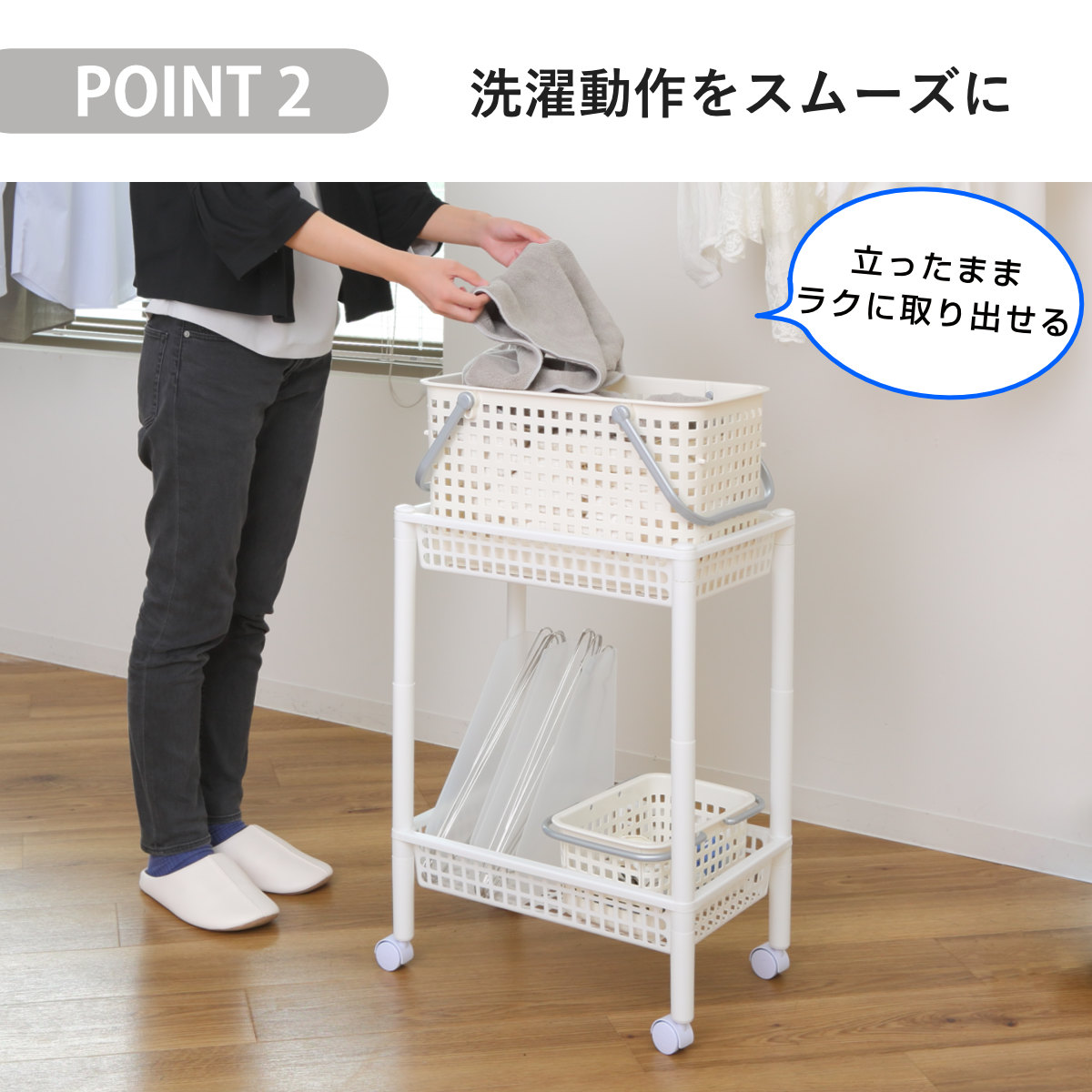 上段にバスケットを配置することで、立ったまま洗濯物を取り出すことができ、干すときはもちろん、洗濯機からの取り出しもスムーズに行えます。腰をかがめる動作が減り、毎日の洗濯がより快適になります。