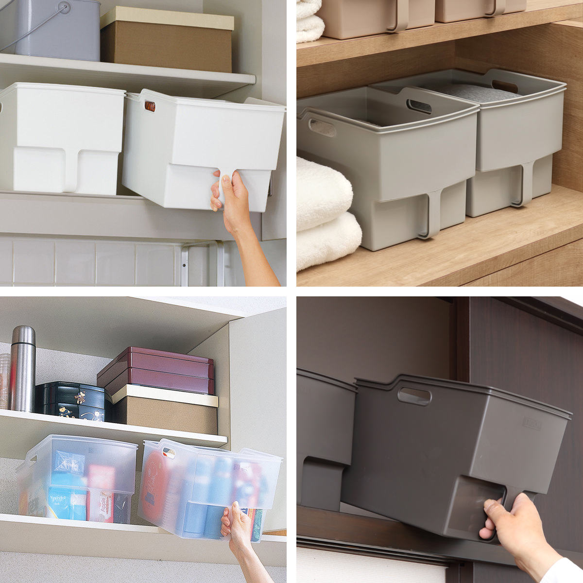 中身を隠してすっきりと見せられる、ホワイト、グレー、ブラウン。中身が程よく透けて収納物を探しやすい、クリア。空間に馴染みの良いカラー展開となっており、収納場所や収納する物に合わせてお選びいただけます。