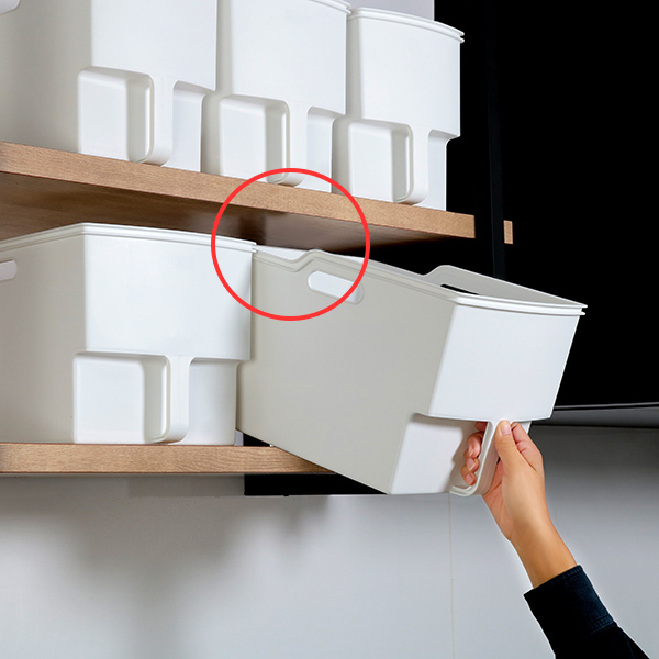 高い場所でも引き出しやすいように取っ手が下に付いています。狭い棚でも引き出しやすいよう、後面には切り欠きが付いているなど、高い所に多い吊戸棚で使うことを考え抜かれた構造になっています。