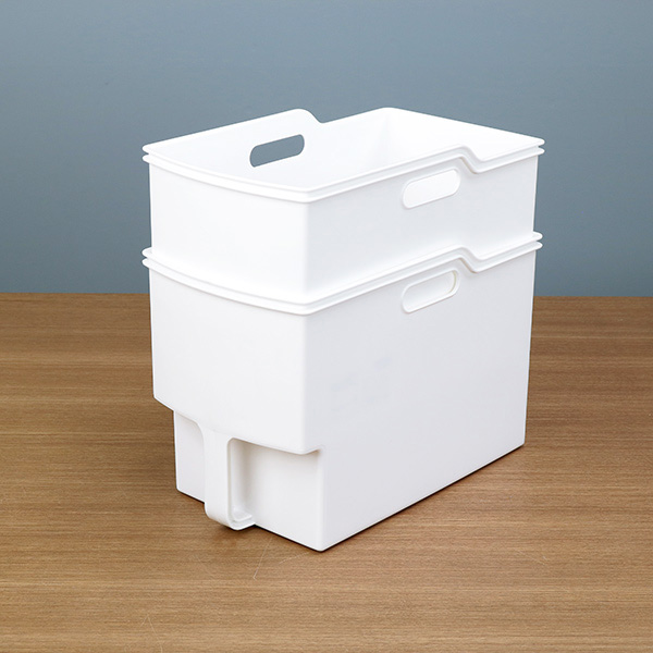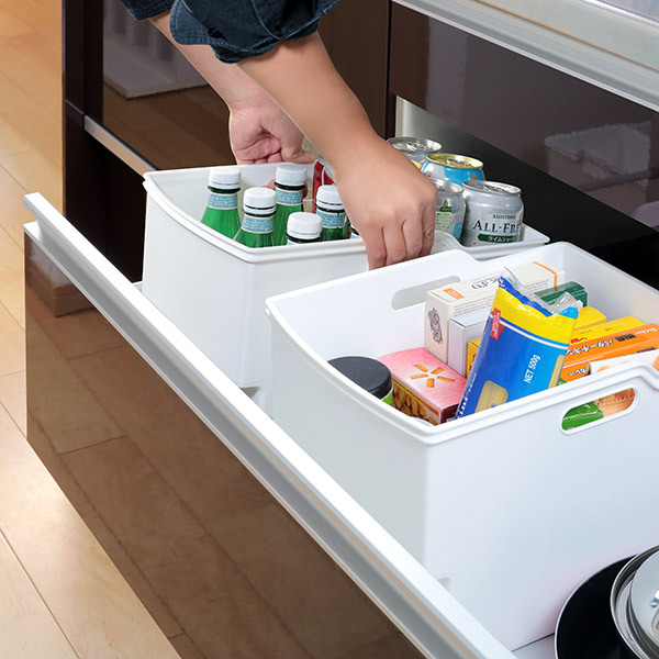 食品や消耗品の収納に便利な取っ手付き収納ボックスです。一般的な吊戸棚は奥行き約36cmのものが多いため、収納して扉も閉められるように奥行き約33.4cmに設計されています。扉のない吊戸棚でも、生活感を隠してすっきりと整理収納できます。