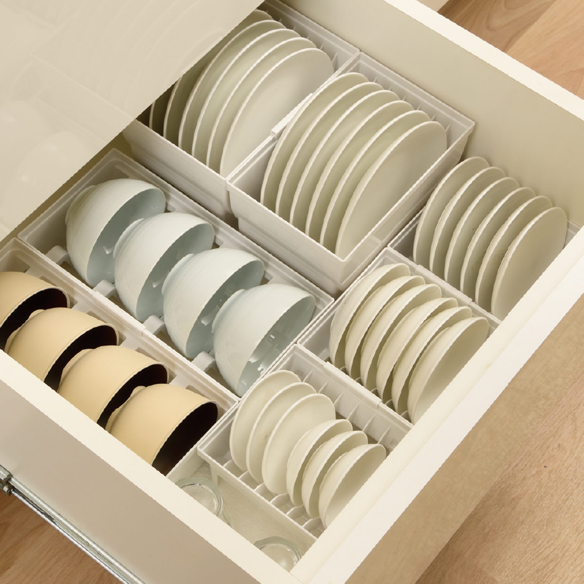 引き出しの中に食器の定位置を作り、美しく収納できます。どこに何があるか引き出しを開けたときに分かりやすく、出した食器をどこに戻すかも一目瞭然です。また、シンクやコンロ下の低い位置に立てて収納することで、お皿が崩れたり落下してしまう事を防ぎ、地震対策になります。